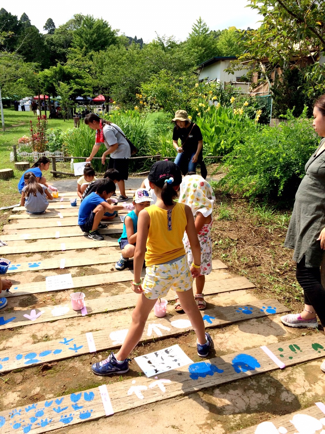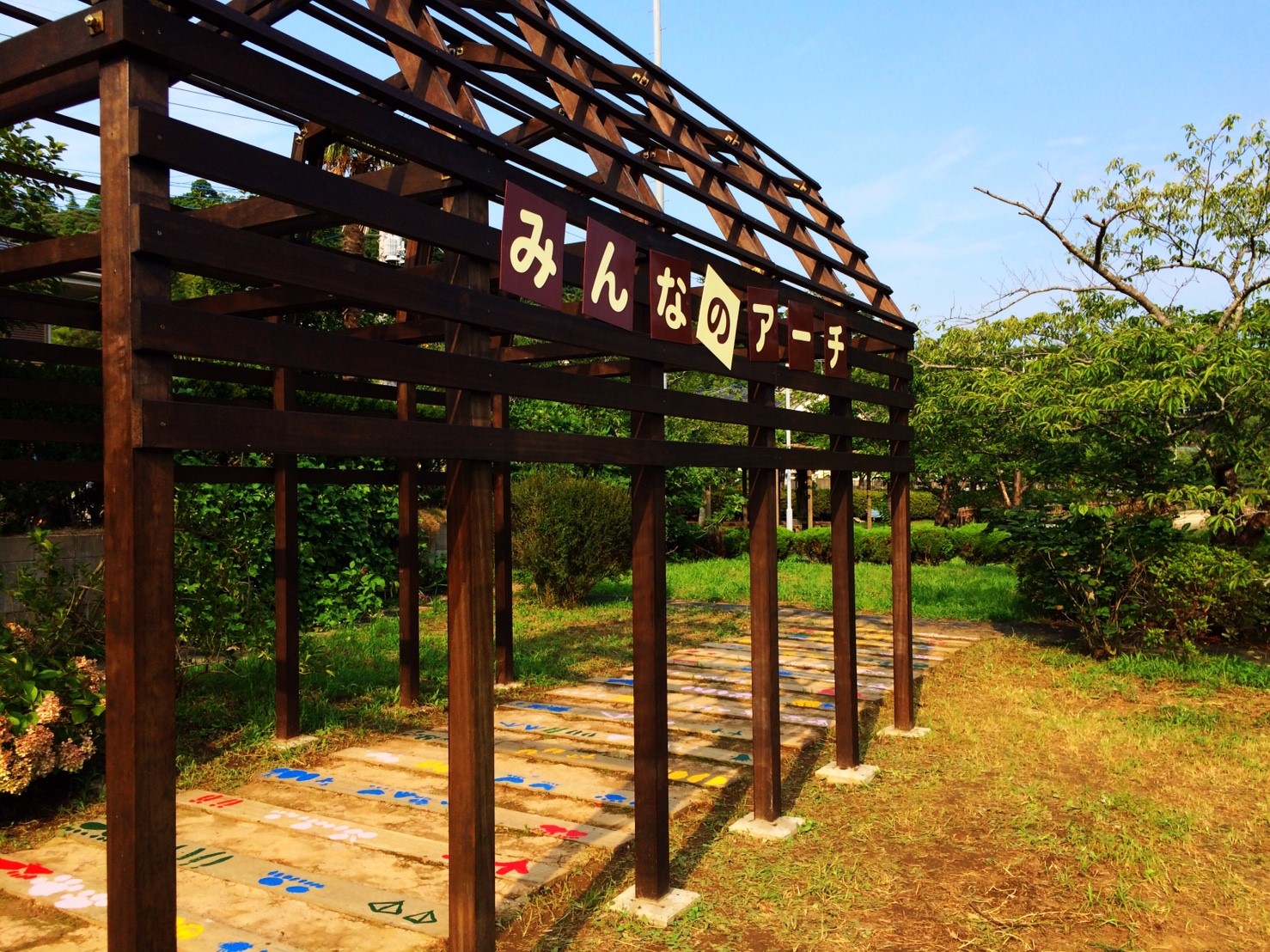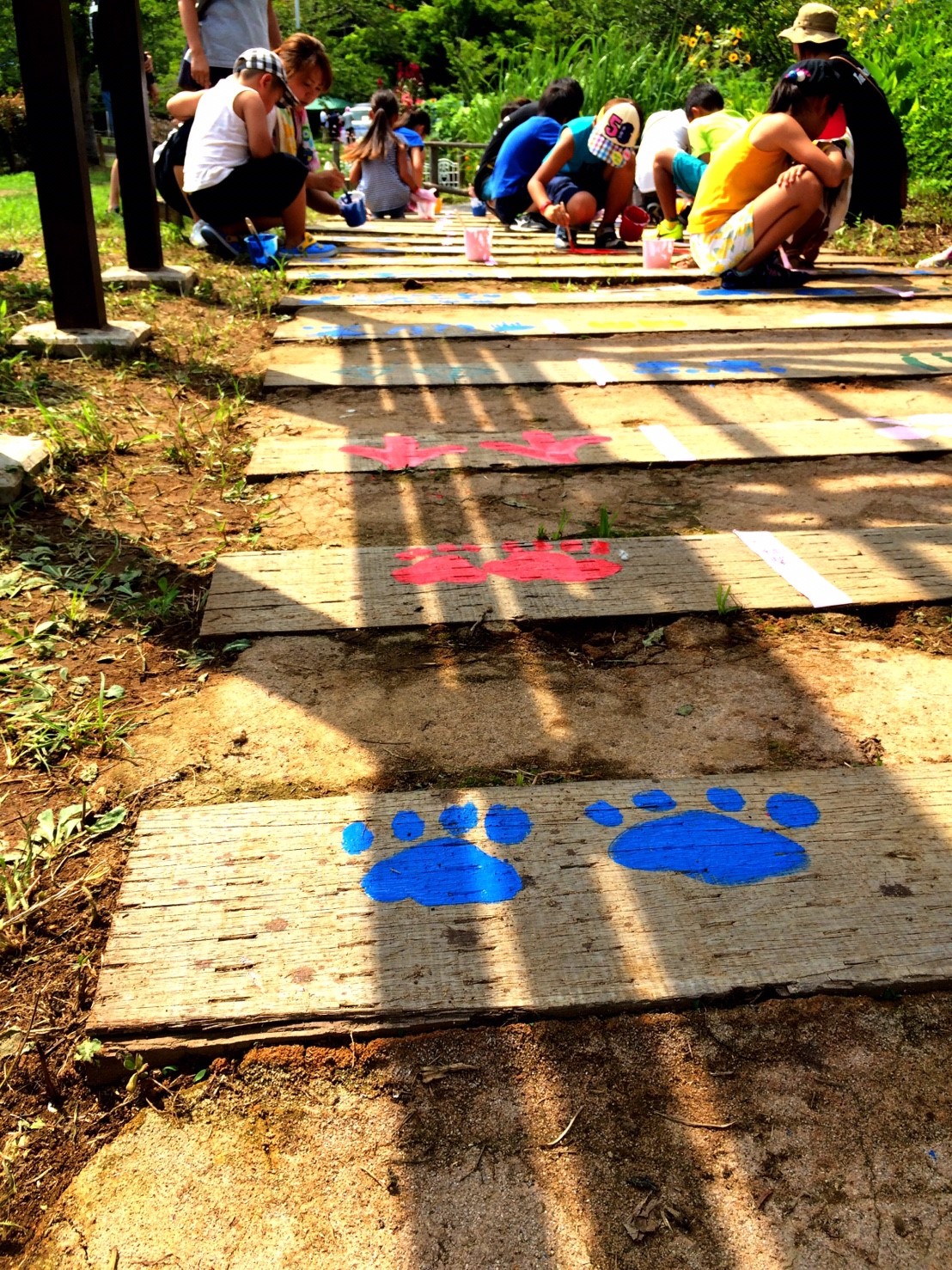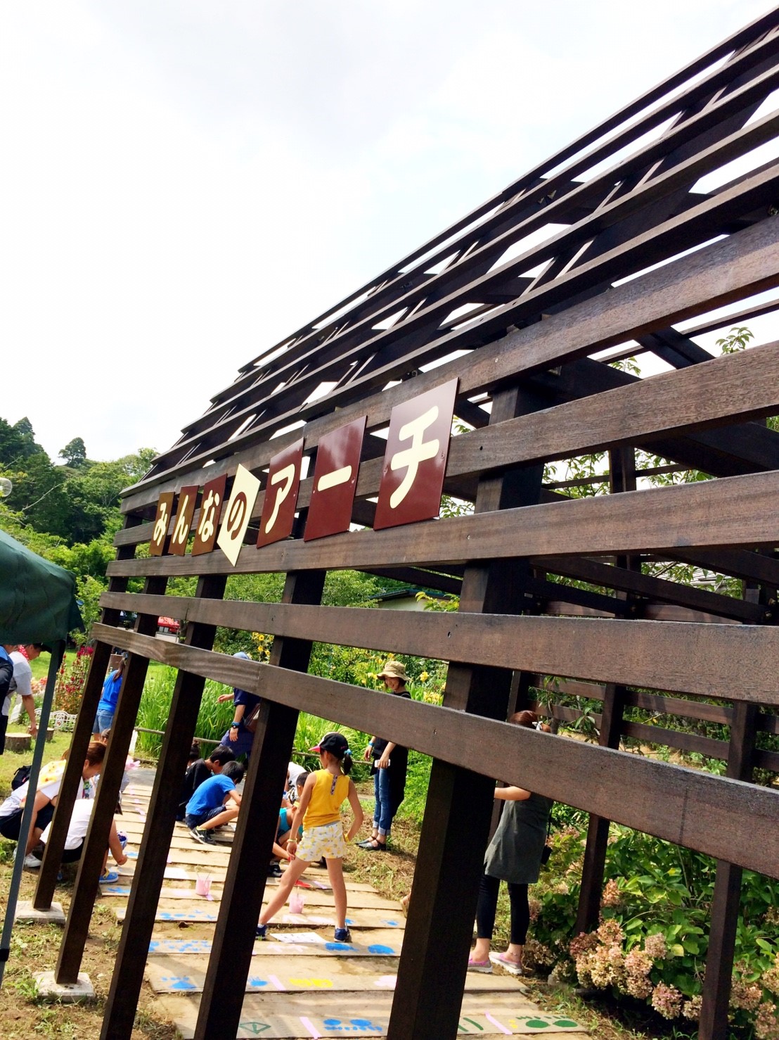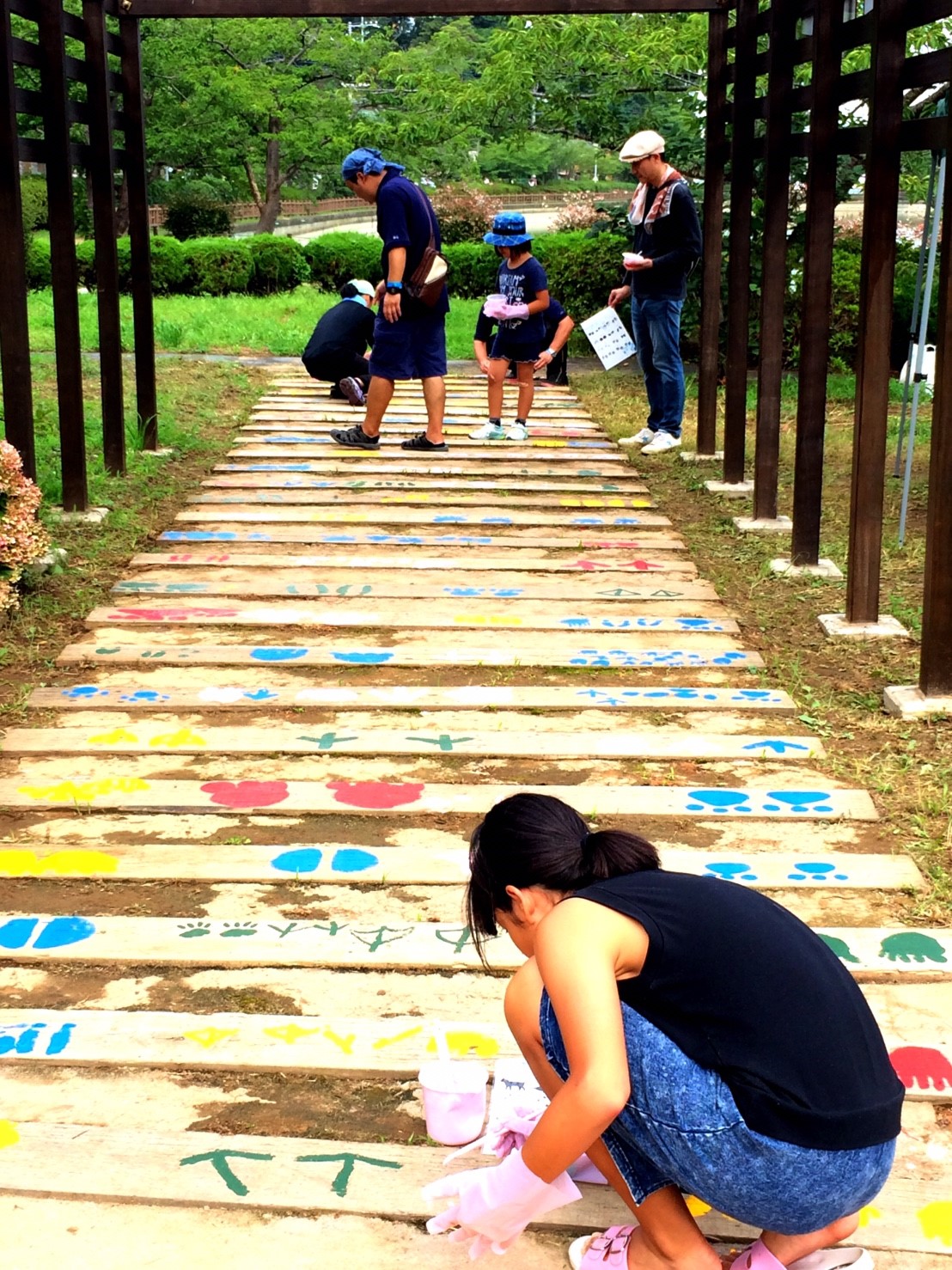 当部員がアーチの枕木に人や動物の足跡をペンキ等で塗り歩道からアーチに誘導させる動線を作ります。枕木から通路が遠い場所はコンクリートなどを段差のないように埋めて同じく足跡を作ります。アーチ入口に看板を設置するために、青年部員で看板を作ります。アーチの名前はチラシで募集し学校に回答BOXを設置させていただき、夏休み前に回収し、役員及びまちづくり委員会にて選考し、採用者には景品を贈呈します。