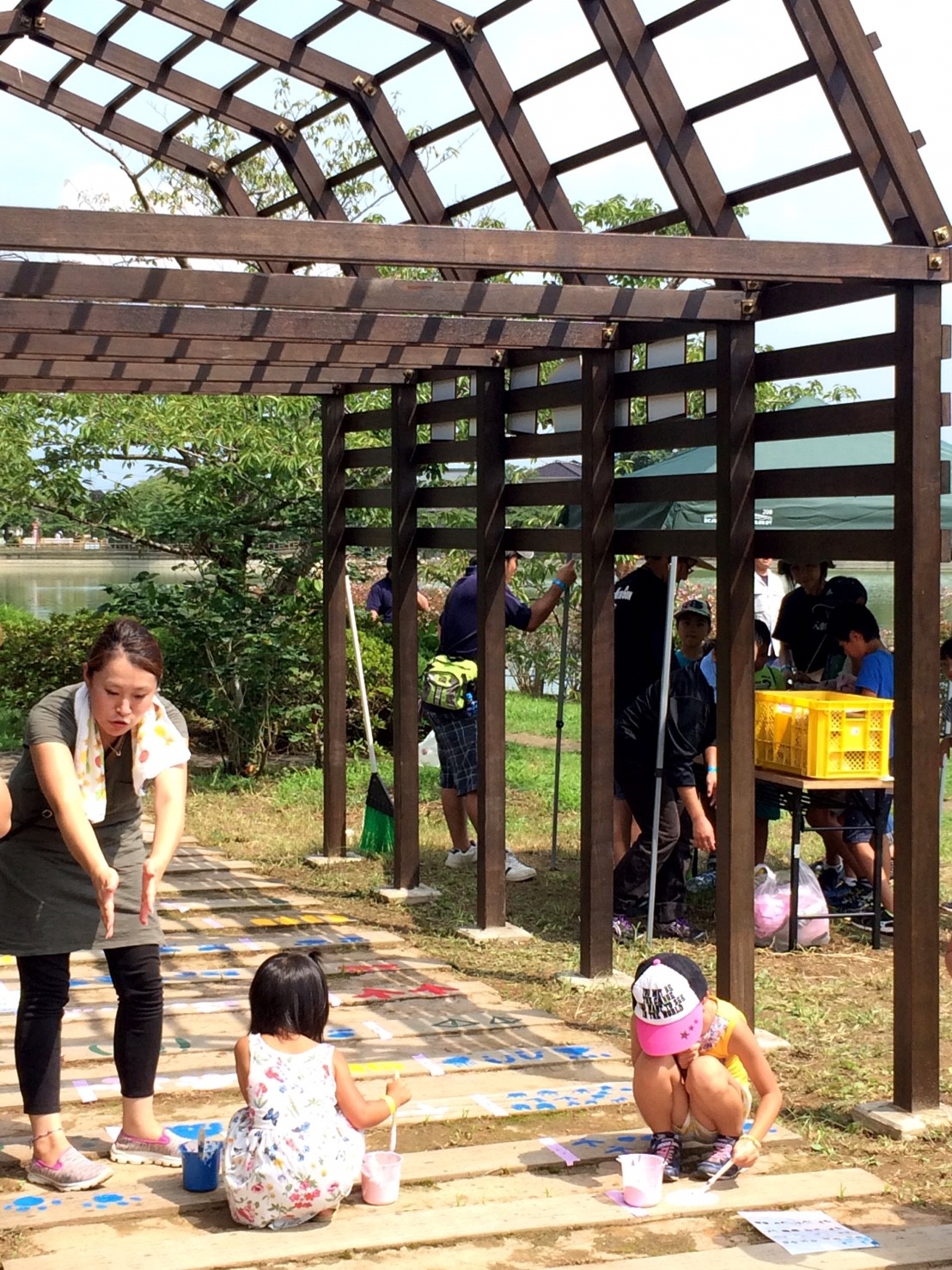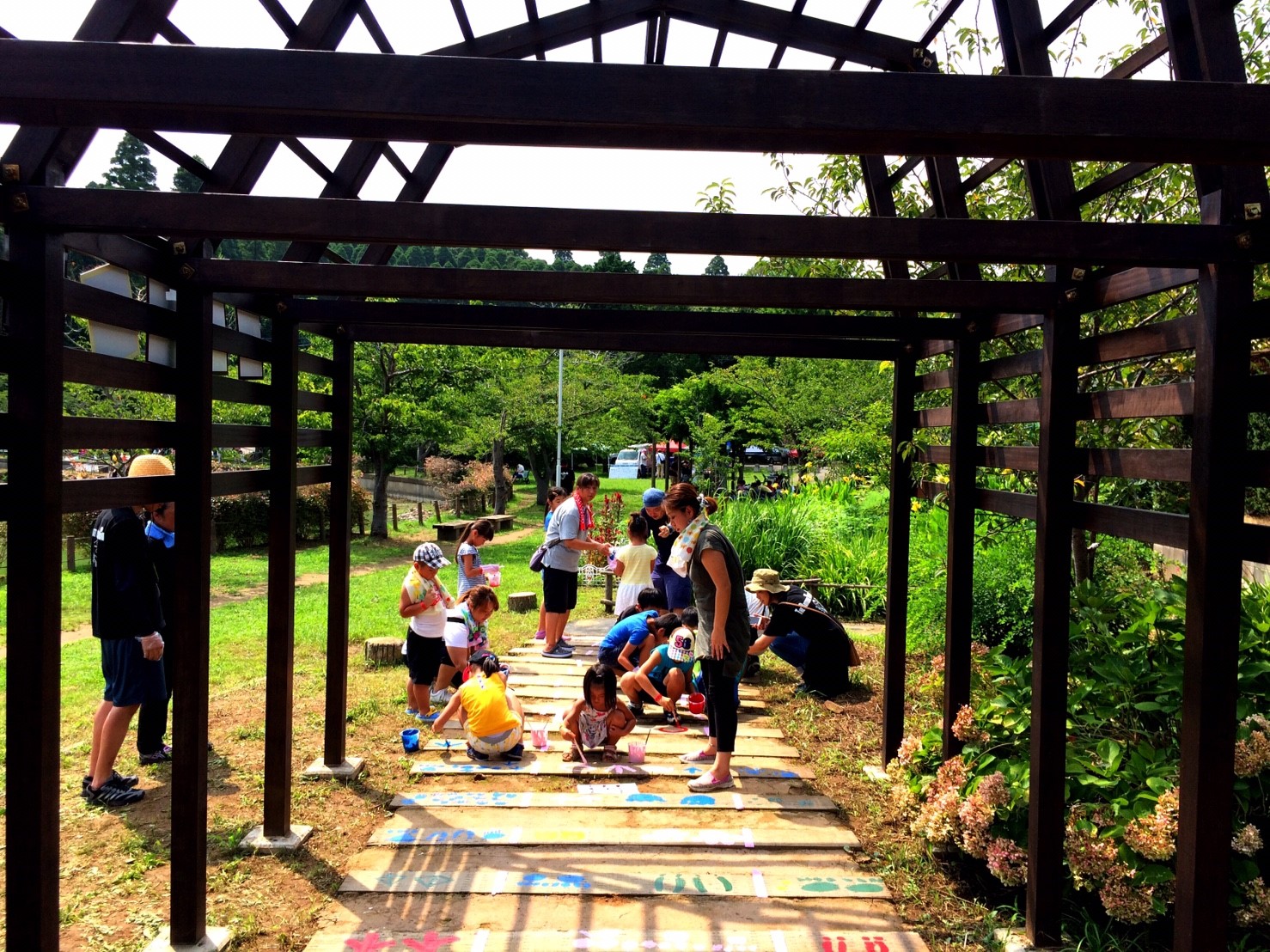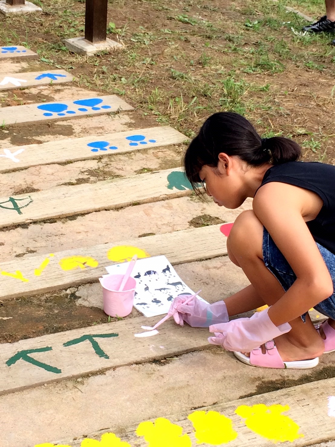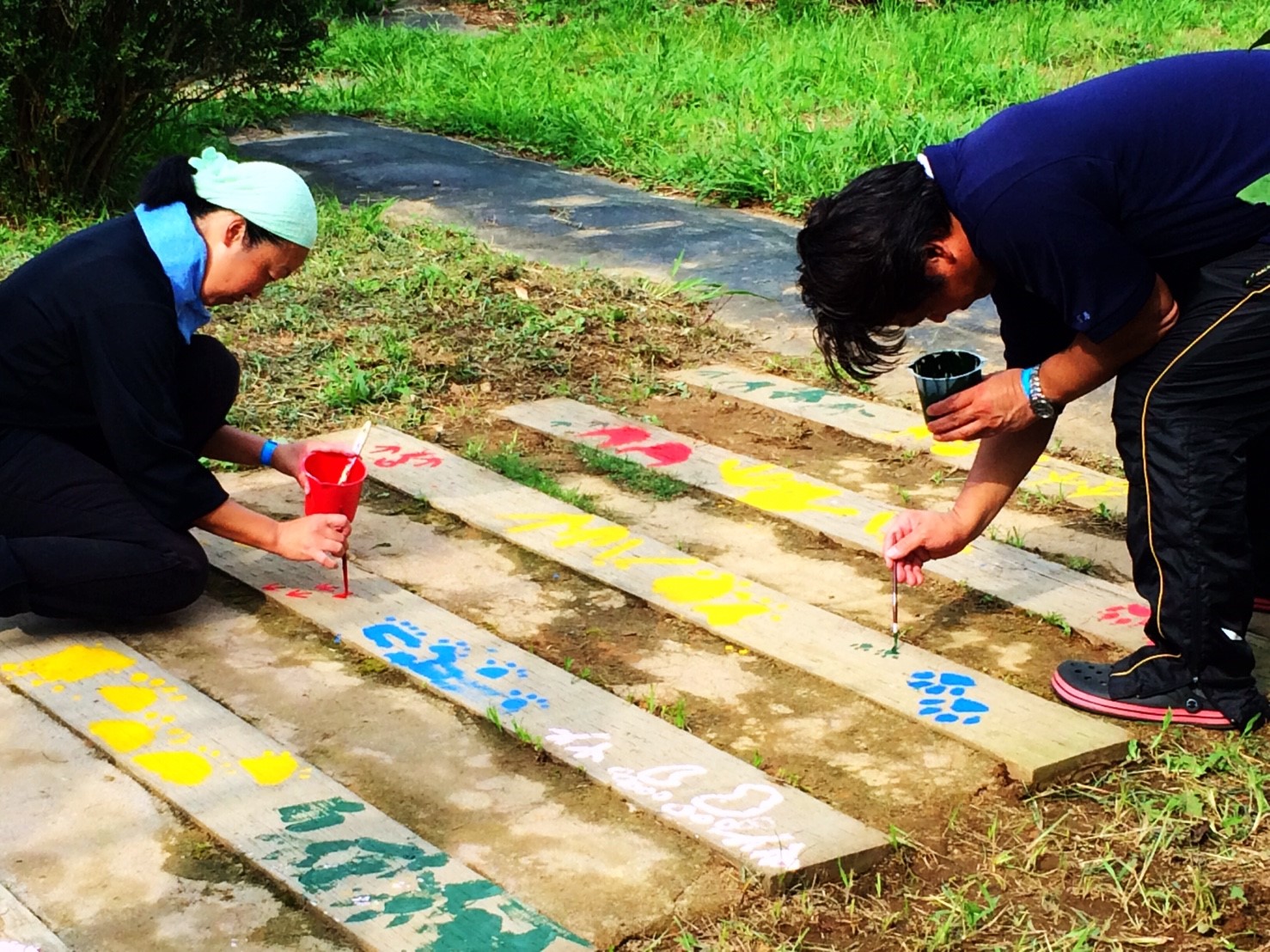 当部員がアーチの枕木に人や動物の足跡をペンキ等で塗り歩道からアーチに誘導させる動線を作ります。枕木から通路が遠い場所はコンクリートなどを段差のないように埋めて同じく足跡を作ります。アーチ入口に看板を設置するために、青年部員で看板を作ります。アーチの名前はチラシで募集し学校に回答BOXを設置させていただき、夏休み前に回収し、役員及びまちづくり委員会にて選考し、採用者には景品を贈呈します。