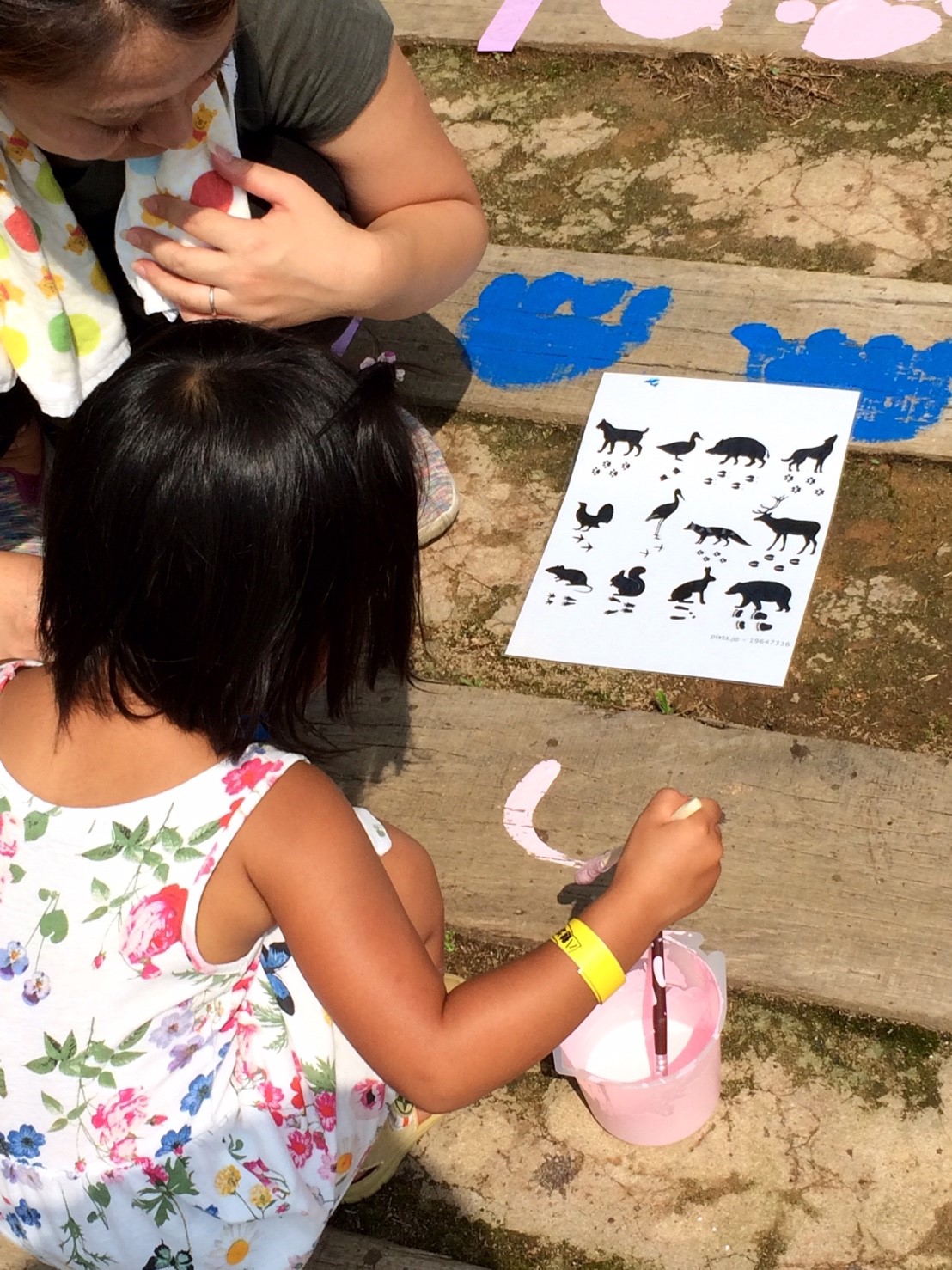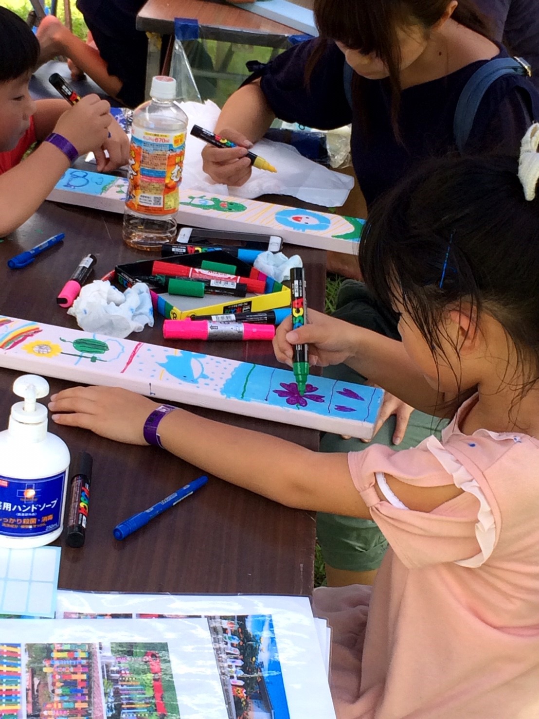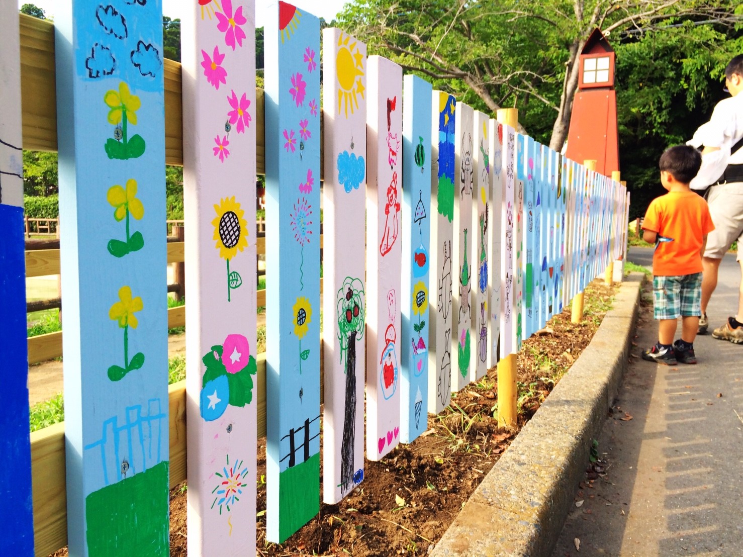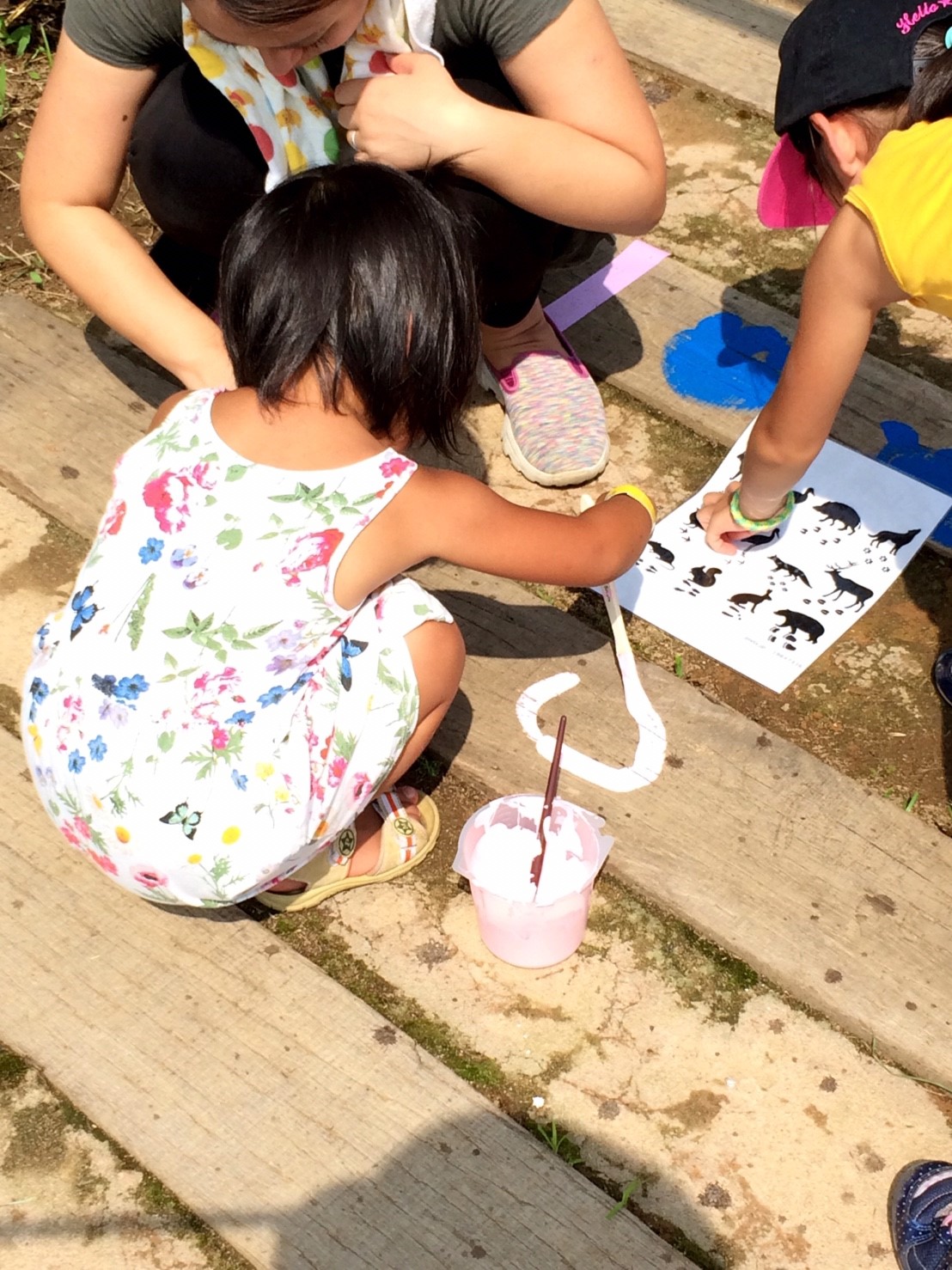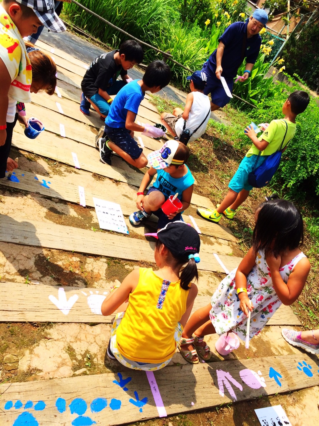 当部員がアーチの枕木に人や動物の足跡をペンキ等で塗り歩道からアーチに誘導させる動線を作ります。枕木から通路が遠い場所はコンクリートなどを段差のないように埋めて同じく足跡を作ります。アーチ入口に看板を設置するために、青年部員で看板を作ります。アーチの名前はチラシで募集し学校に回答BOXを設置させていただき、夏休み前に回収し、役員及びまちづくり委員会にて選考し、採用者には景品を贈呈します。
