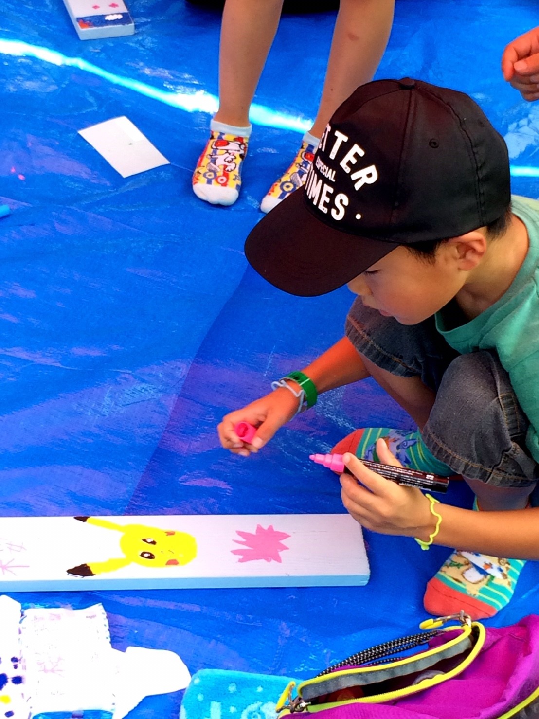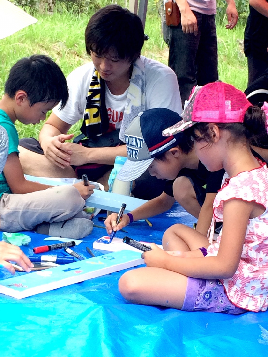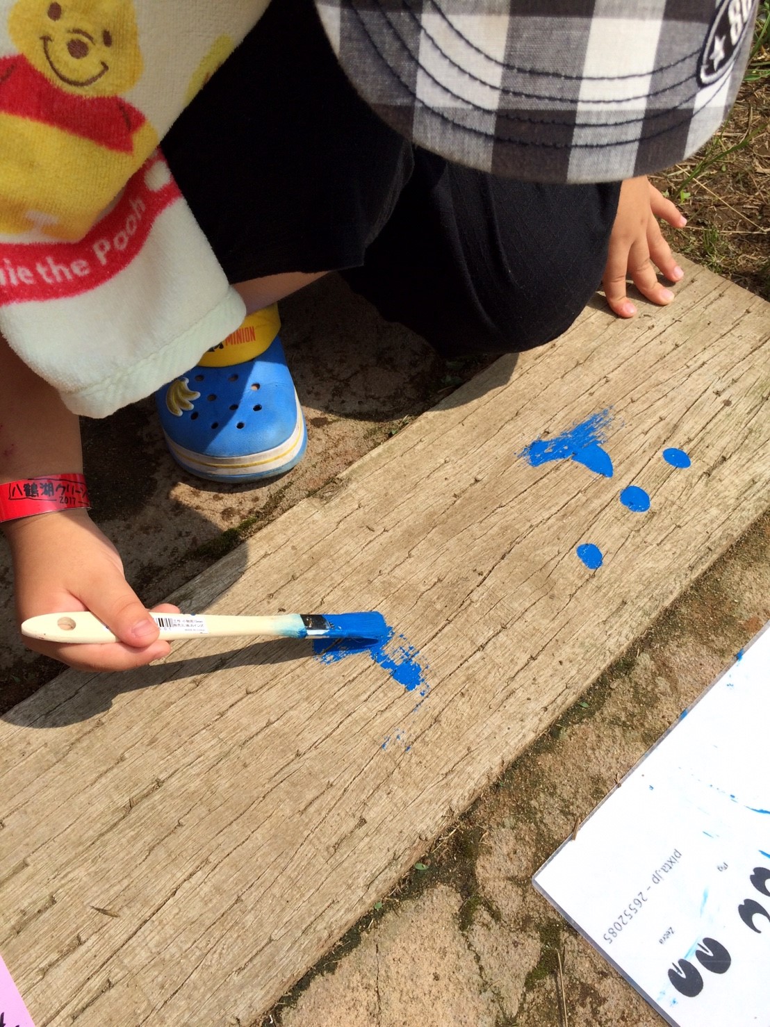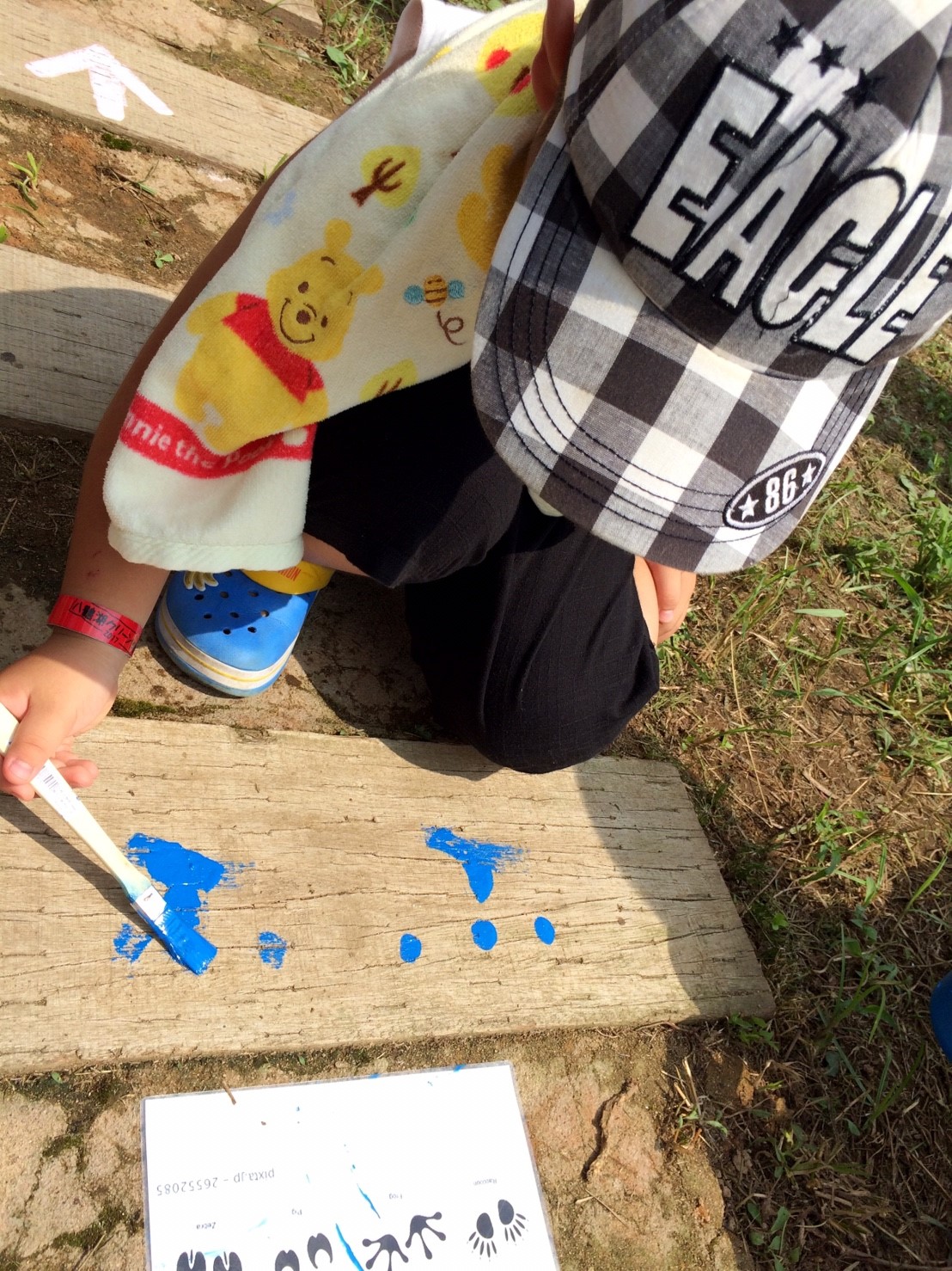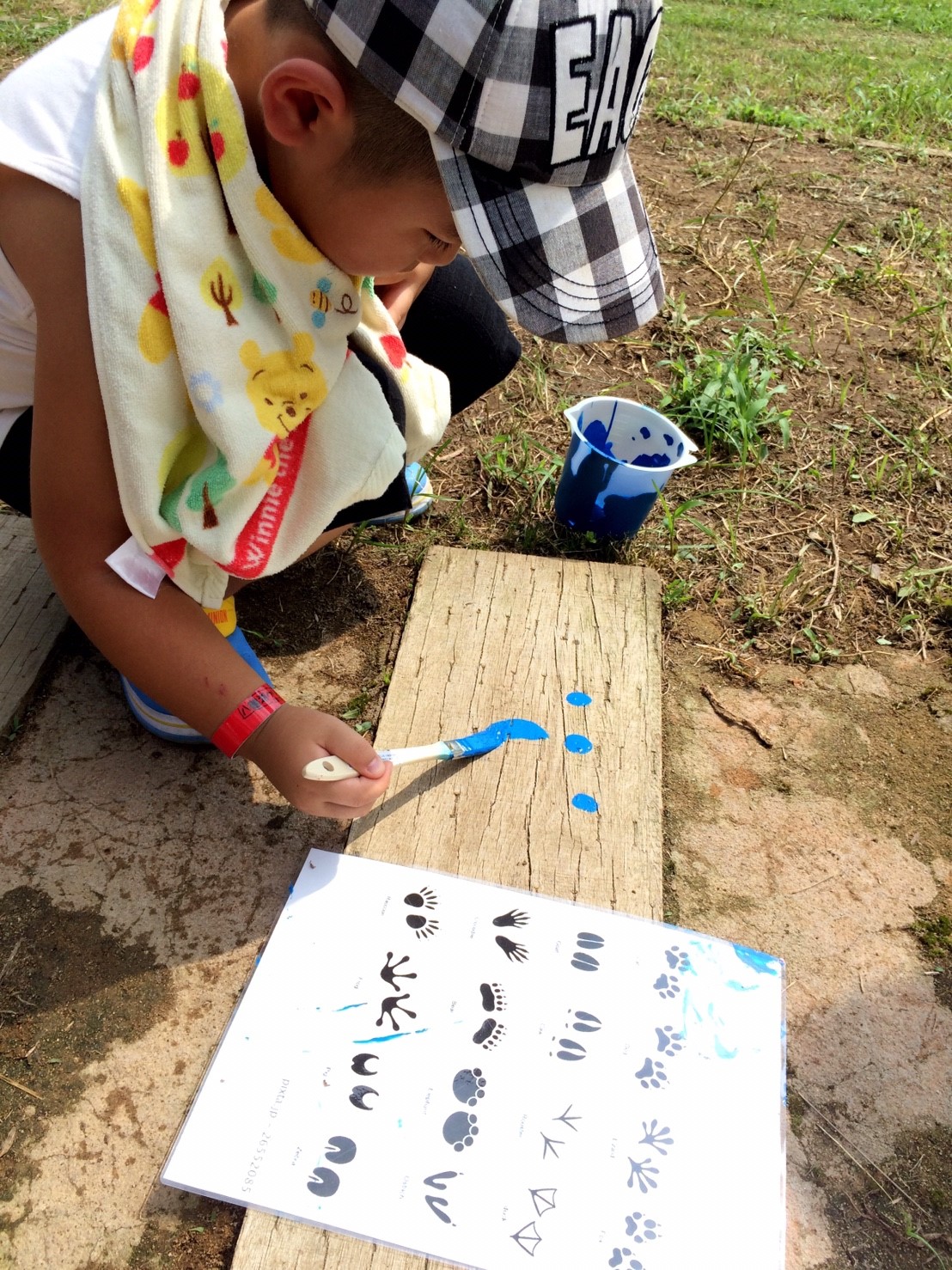 当部員がアーチの枕木に人や動物の足跡をペンキ等で塗り歩道からアーチに誘導させる動線を作ります。枕木から通路が遠い場所はコンクリートなどを段差のないように埋めて同じく足跡を作ります。アーチ入口に看板を設置するために、青年部員で看板を作ります。アーチの名前はチラシで募集し学校に回答BOXを設置させていただき、夏休み前に回収し、役員及びまちづくり委員会にて選考し、採用者には景品を贈呈します。