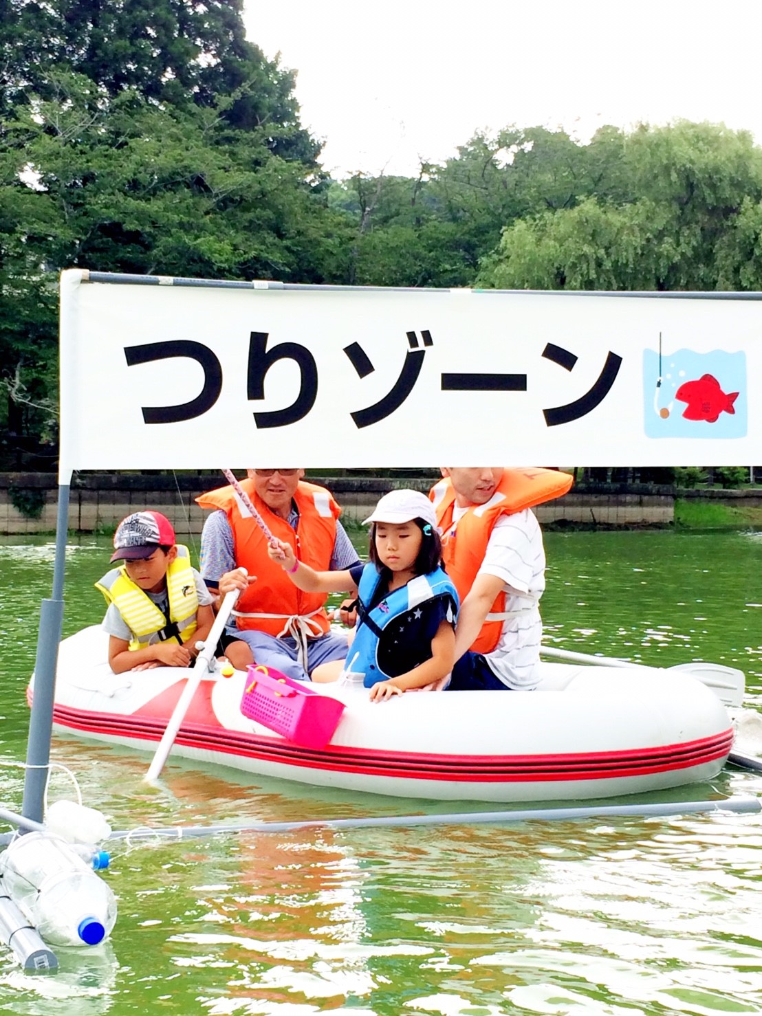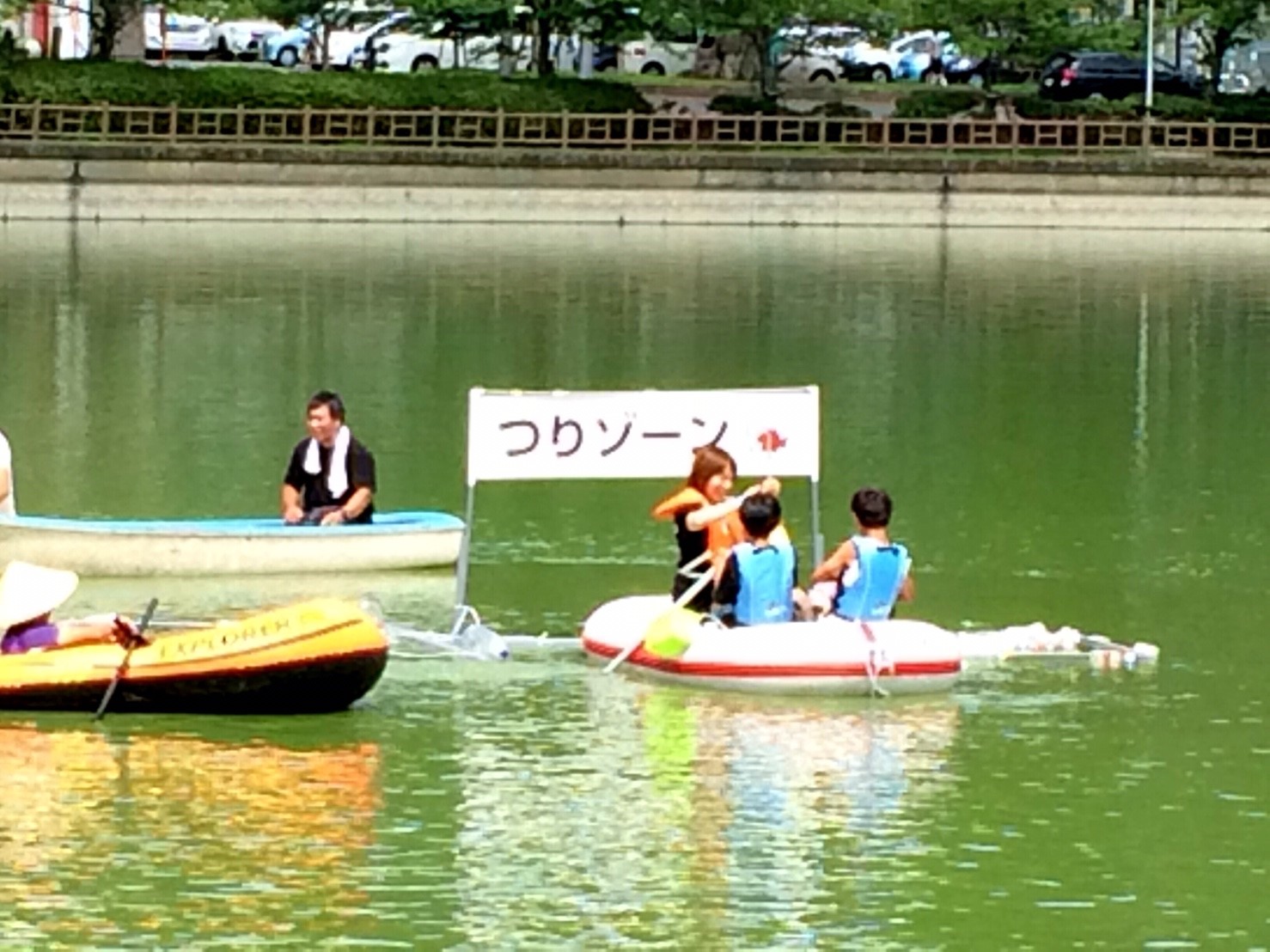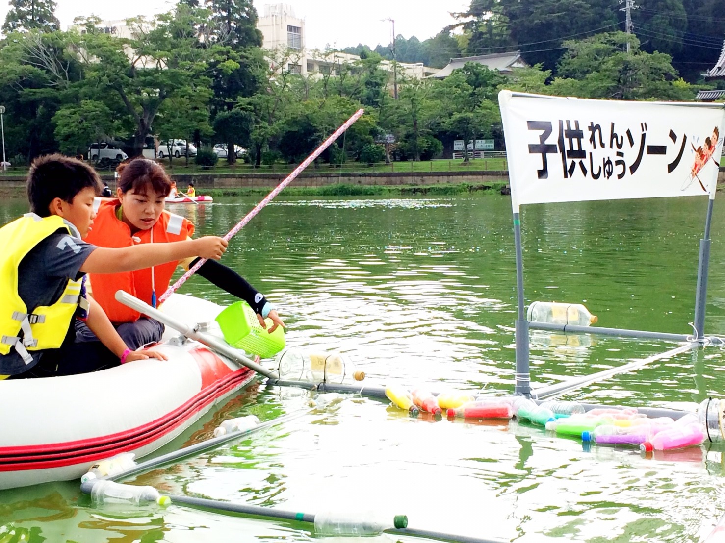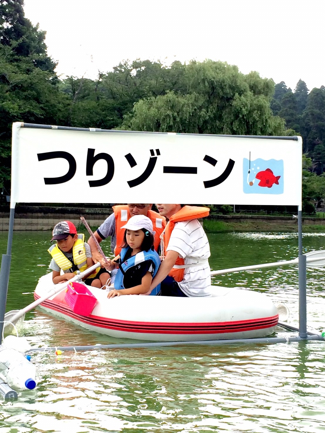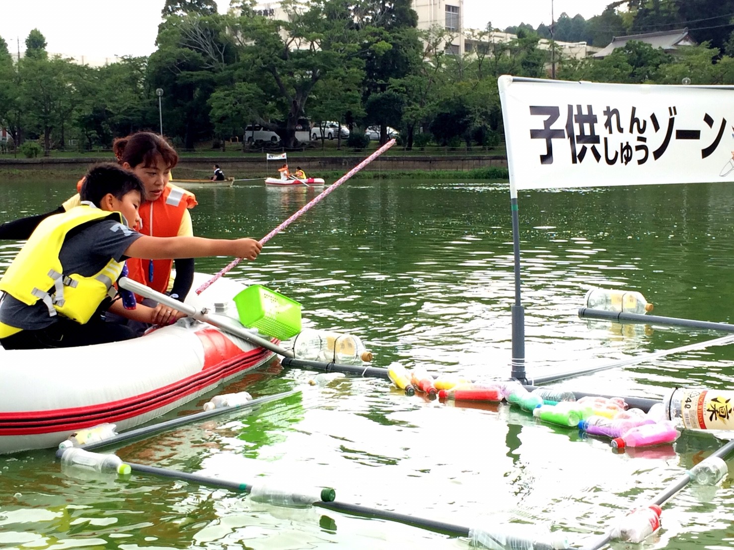 「八鶴湖クルーズ」ではボートを利用し、八鶴湖の水質に直に触れてもらうことで、八鶴湖の水質及び環境改善に対する意識の向上を図ります。 対象者は小学生とお父さん、またはお母さんの2組1チームでボートに乗り15分以内に湖畔のコースをクルーズし、景品が当たる抽選番号をGETしてもらう競技です。コースはボートに慣れてもらう練習ゾーン、そして中継ポイント「釣りゾーン」にて抽選番号を吊り上げてもらいます。そして「問題ゾーン」では八鶴湖にちなんだ問題をGETし、ゴールテントで答え合わせ、正解すればもう一つ抽選番号がもらえる仕組みです。抽選番号は最後までもってると良いことが起こるかも!!