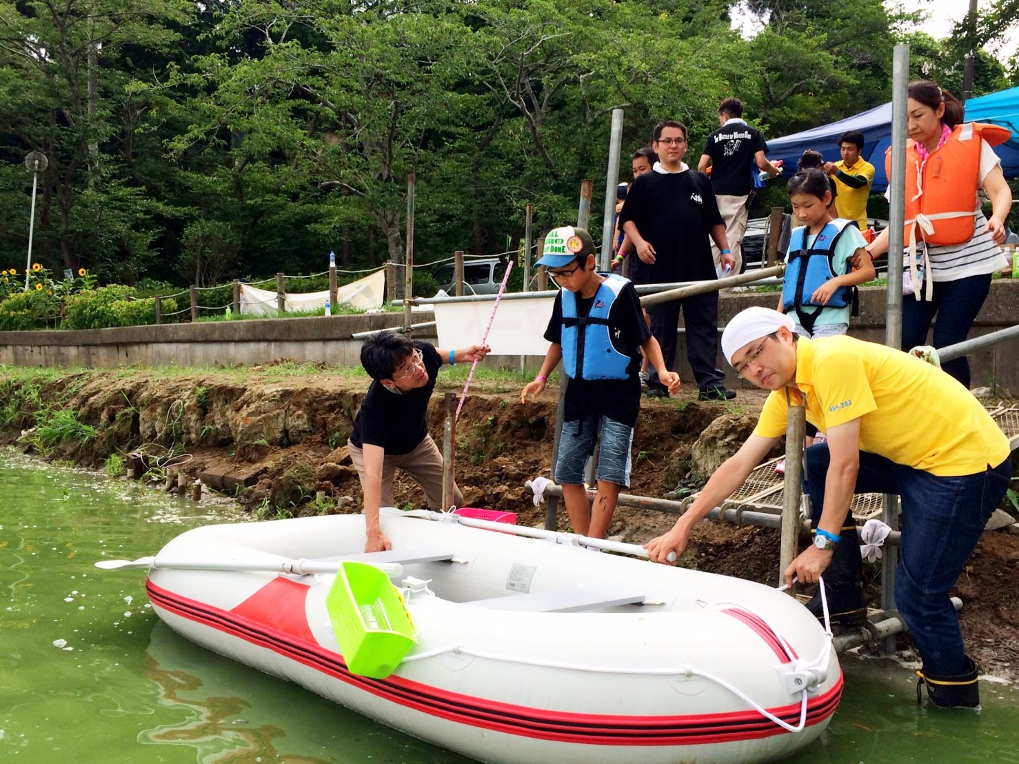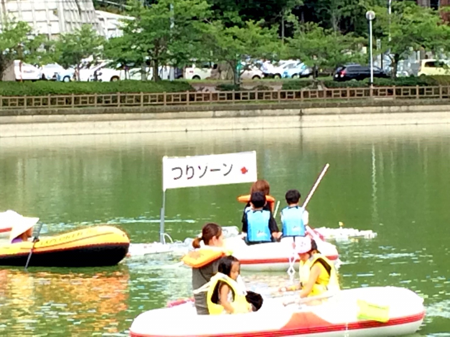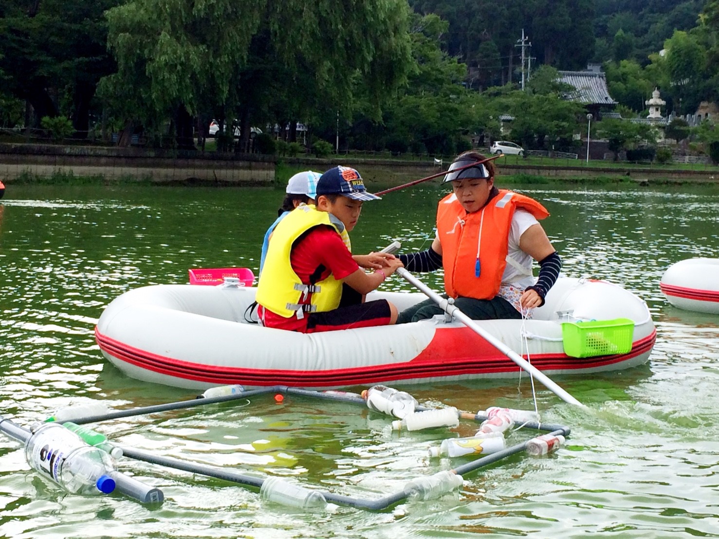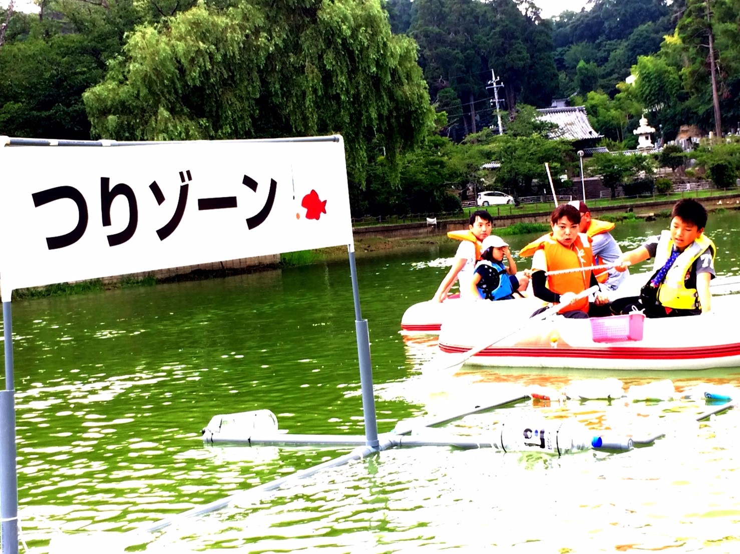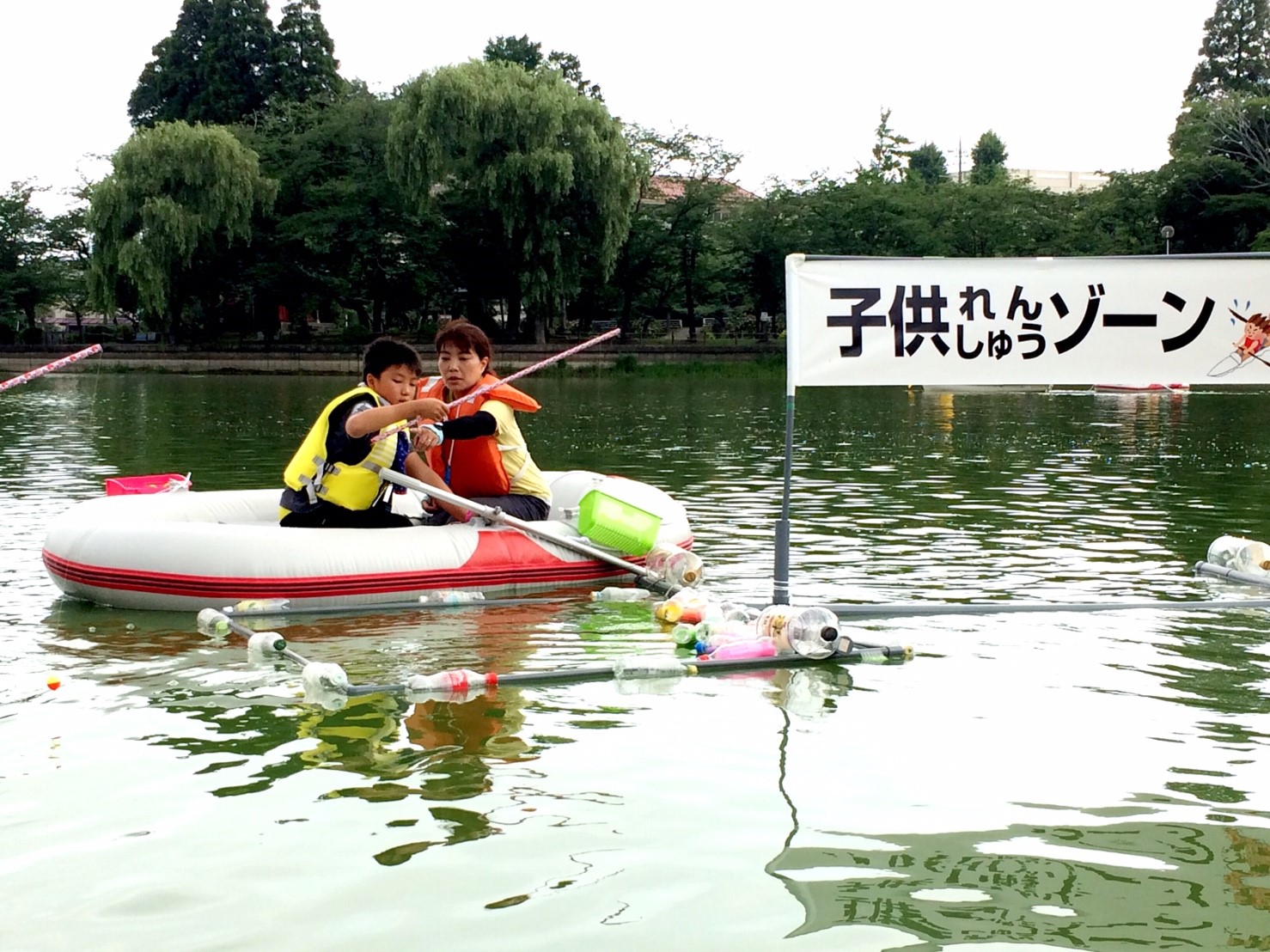「八鶴湖クルーズ」ではボートを利用し、八鶴湖の水質に直に触れてもらうことで、八鶴湖の水質及び環境改善に対する意識の向上を図ります。 対象者は小学生とお父さん、またはお母さんの2組1チームでボートに乗り15分以内に湖畔のコースをクルーズし、景品が当たる抽選番号をGETしてもらう競技です。コースはボートに慣れてもらう練習ゾーン、そして中継ポイント「釣りゾーン」にて抽選番号を吊り上げてもらいます。そして「問題ゾーン」では八鶴湖にちなんだ問題をGETし、ゴールテントで答え合わせ、正解すればもう一つ抽選番号がもらえる仕組みです。抽選番号は最後までもってると良いことが起こるかも!!