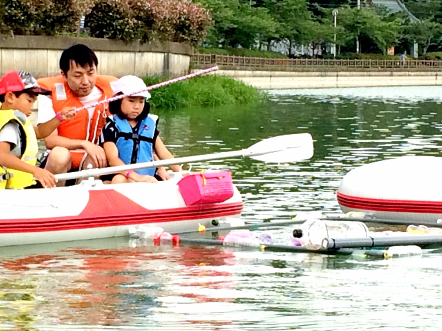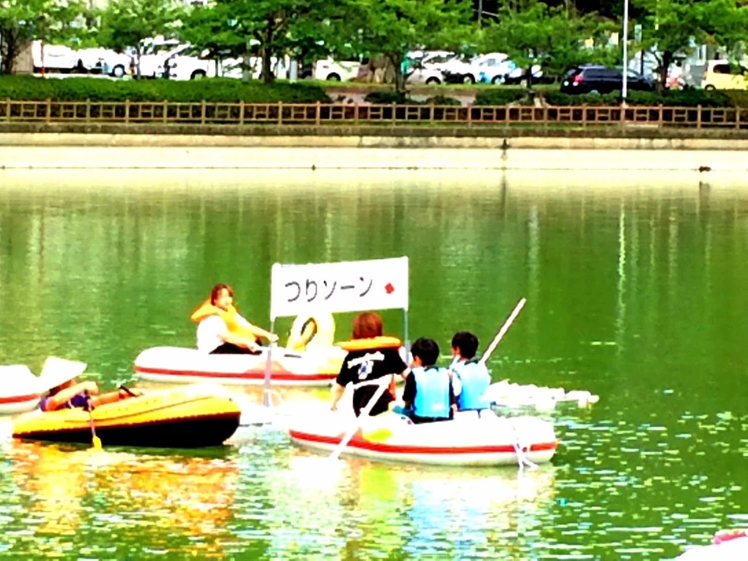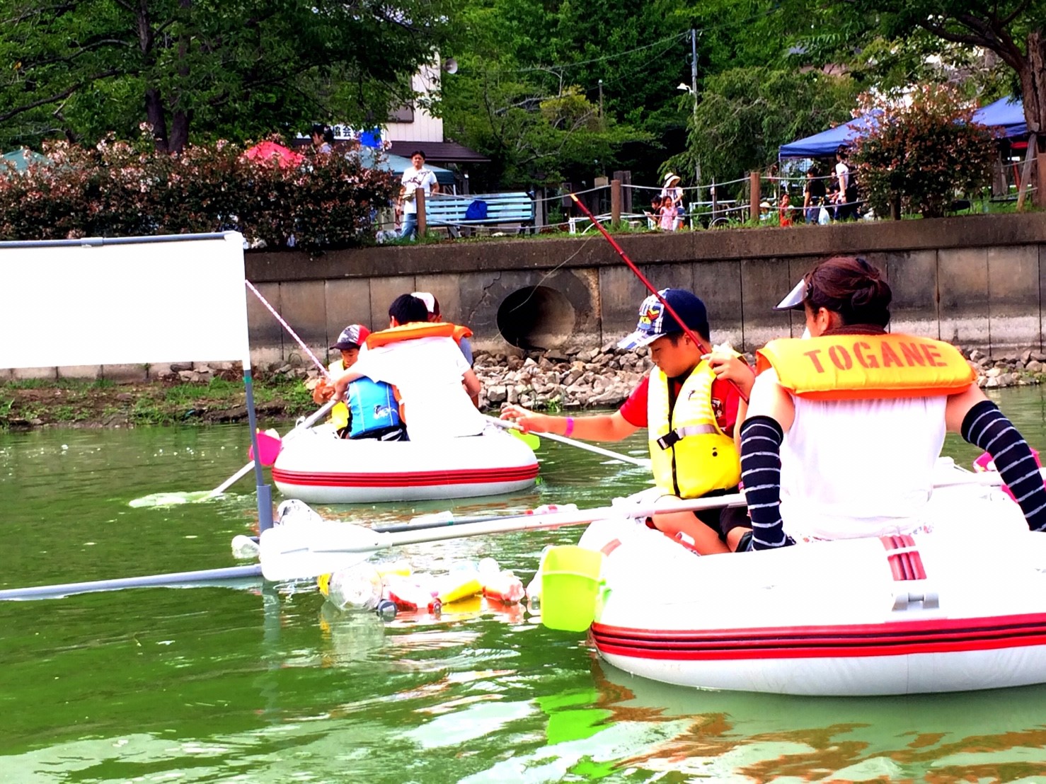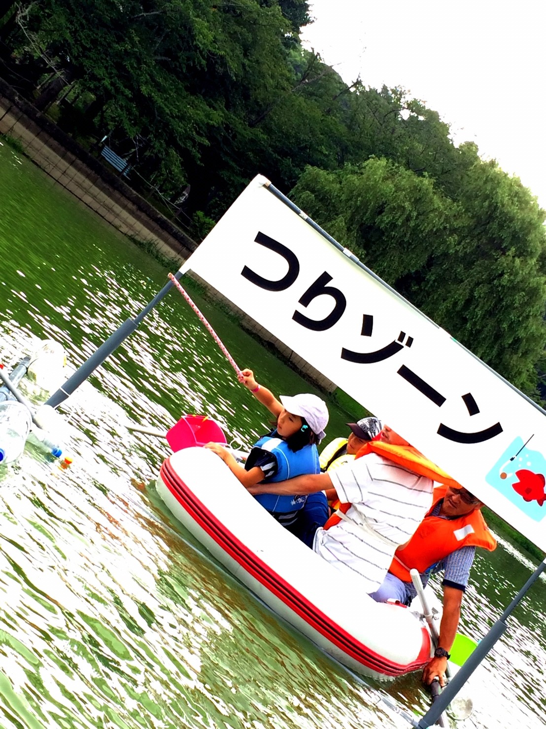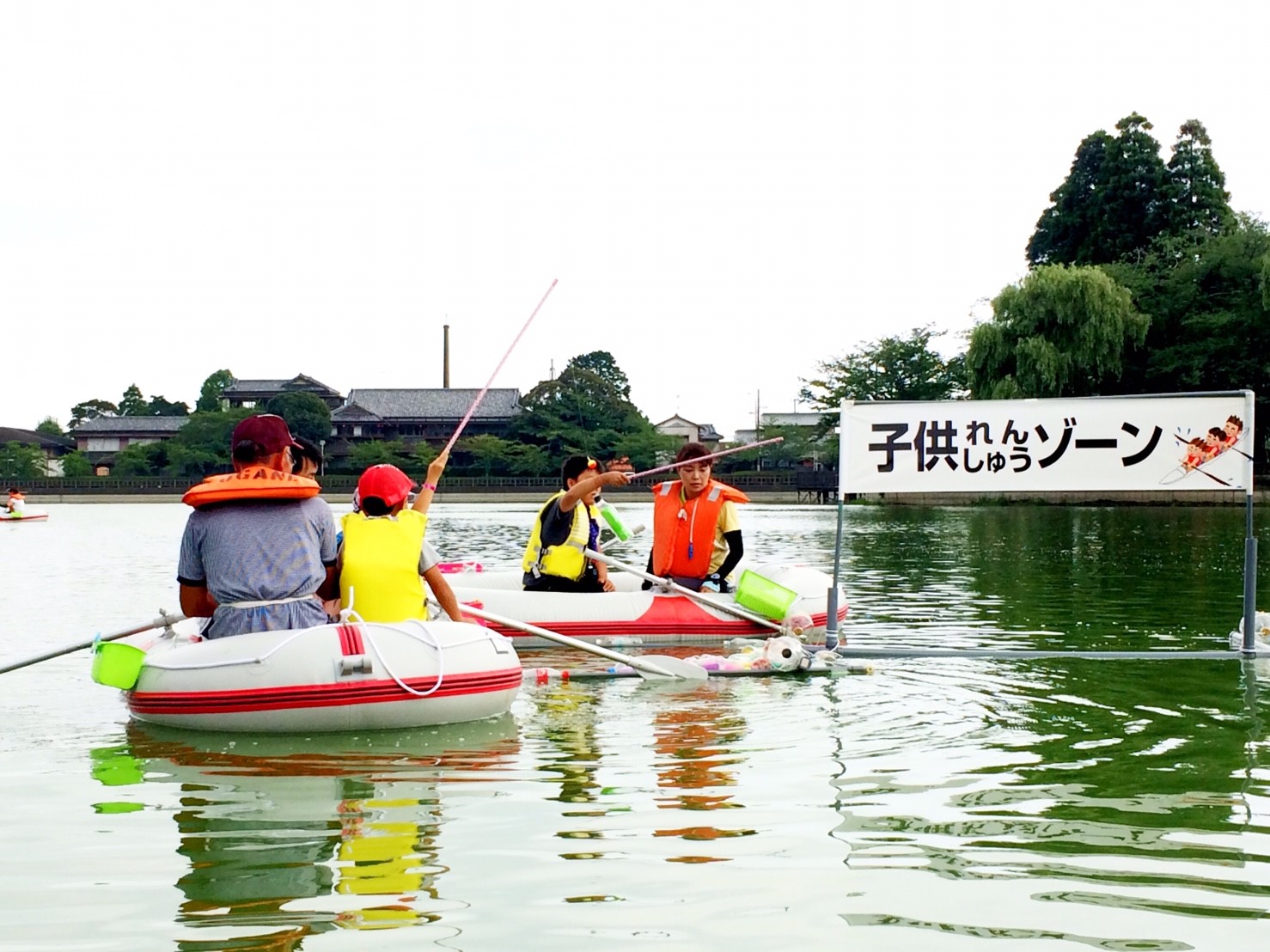 「八鶴湖クルーズ」ではボートを利用し、八鶴湖の水質に直に触れてもらうことで、八鶴湖の水質及び環境改善に対する意識の向上を図ります。 対象者は小学生とお父さん、またはお母さんの2組1チームでボートに乗り15分以内に湖畔のコースをクルーズし、景品が当たる抽選番号をGETしてもらう競技です。コースはボートに慣れてもらう練習ゾーン、そして中継ポイント「釣りゾーン」にて抽選番号を吊り上げてもらいます。そして「問題ゾーン」では八鶴湖にちなんだ問題をGETし、ゴールテントで答え合わせ、正解すればもう一つ抽選番号がもらえる仕組みです。抽選番号は最後までもってると良いことが起こるかも!!