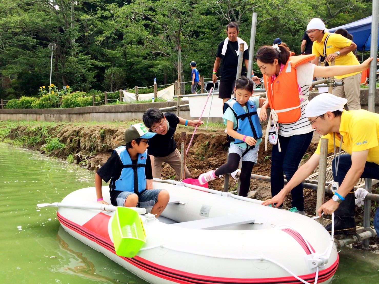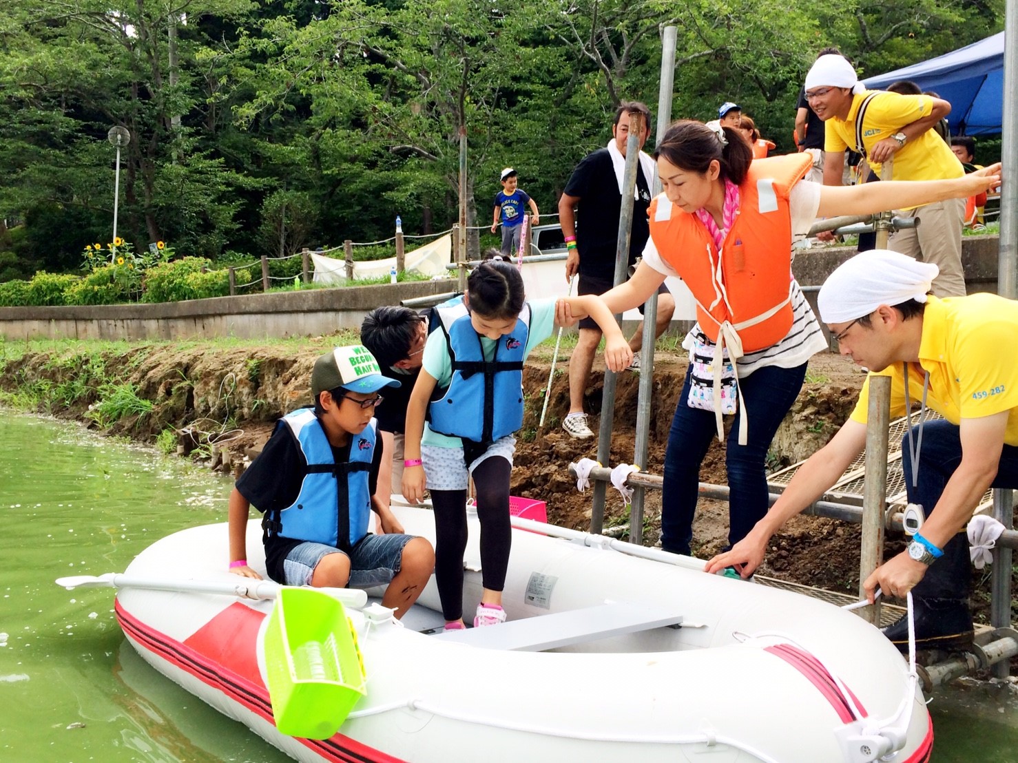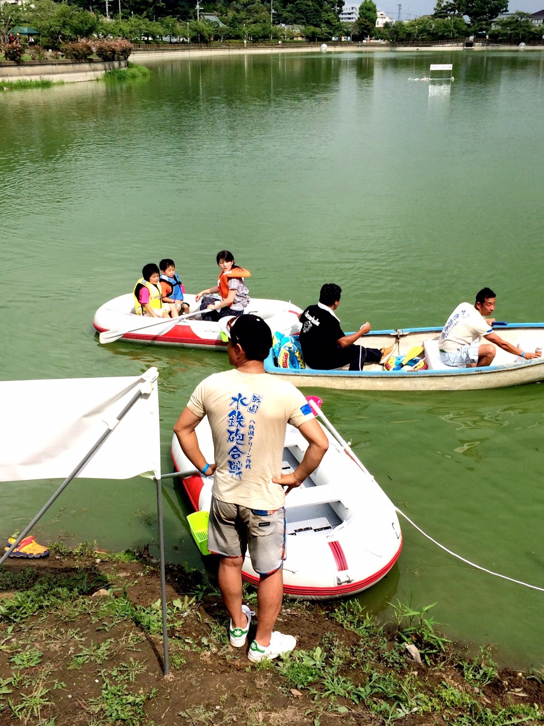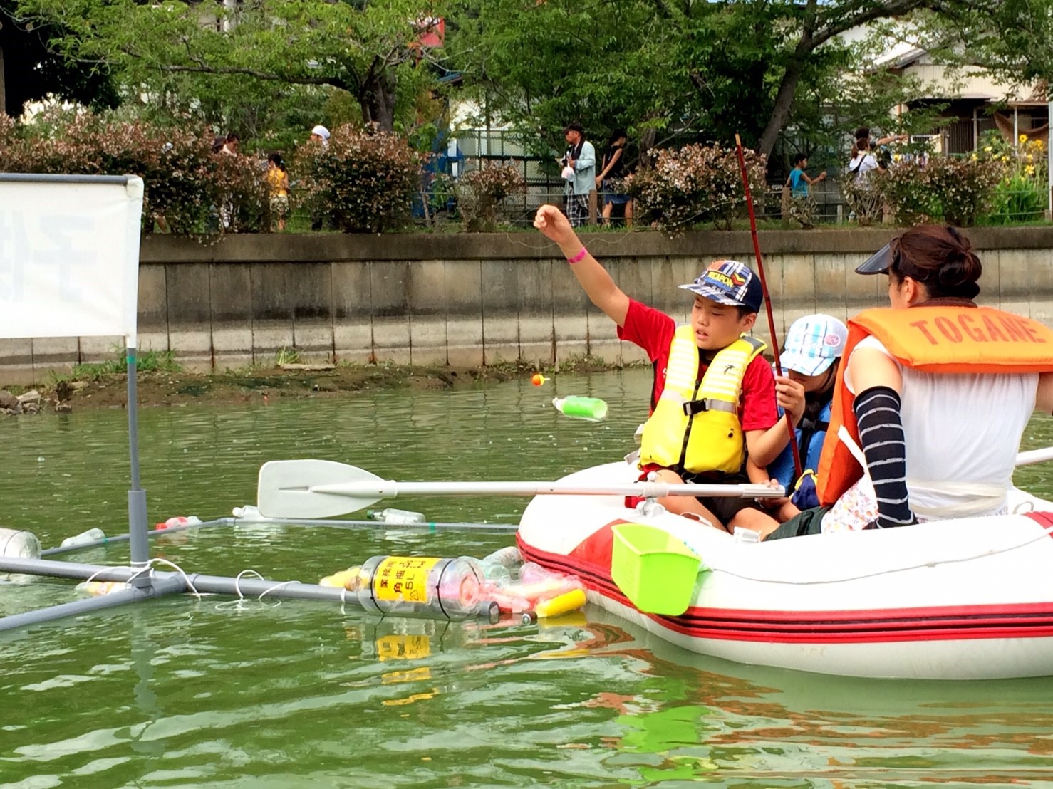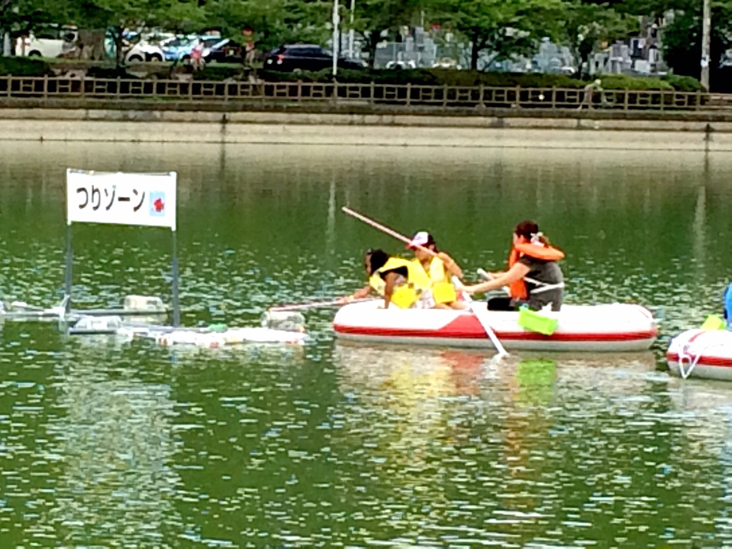 「八鶴湖クルーズ」ではボートを利用し、八鶴湖の水質に直に触れてもらうことで、八鶴湖の水質及び環境改善に対する意識の向上を図ります。 対象者は小学生とお父さん、またはお母さんの2組1チームでボートに乗り15分以内に湖畔のコースをクルーズし、景品が当たる抽選番号をGETしてもらう競技です。コースはボートに慣れてもらう練習ゾーン、そして中継ポイント「釣りゾーン」にて抽選番号を吊り上げてもらいます。そして「問題ゾーン」では八鶴湖にちなんだ問題をGETし、ゴールテントで答え合わせ、正解すればもう一つ抽選番号がもらえる仕組みです。抽選番号は最後までもってると良いことが起こるかも!!