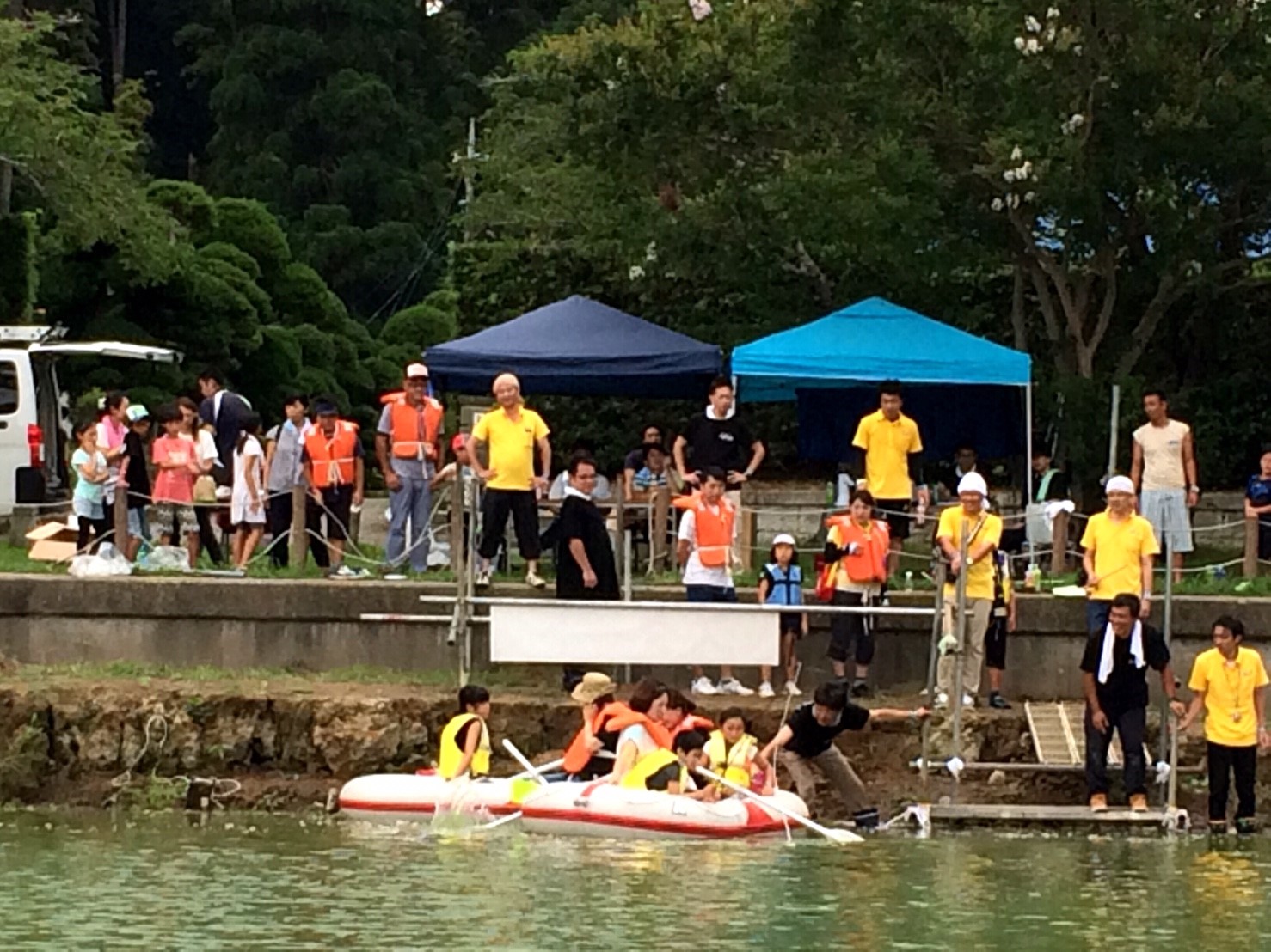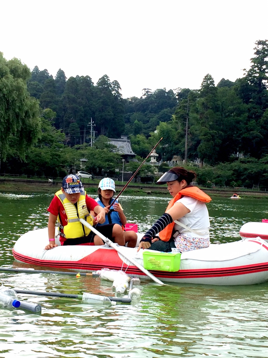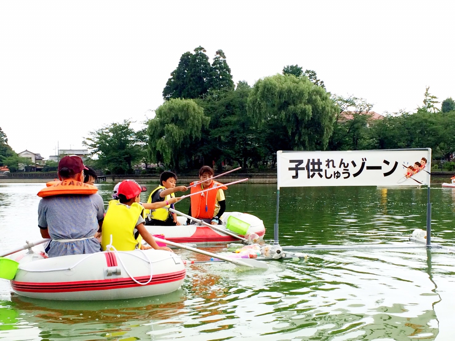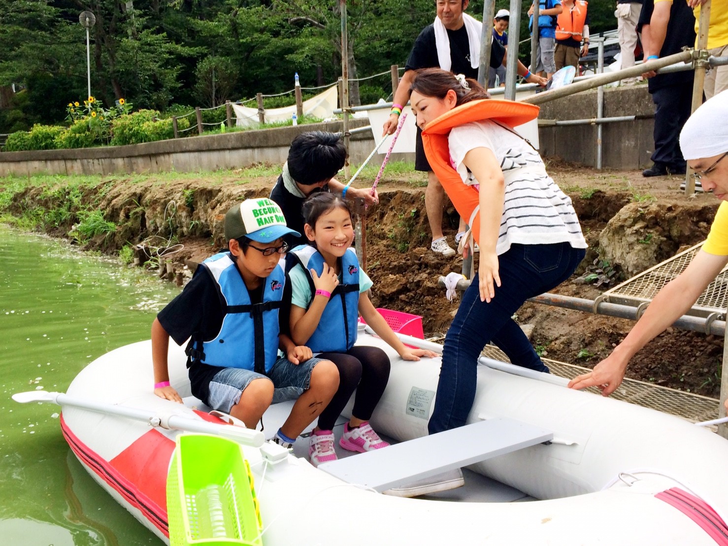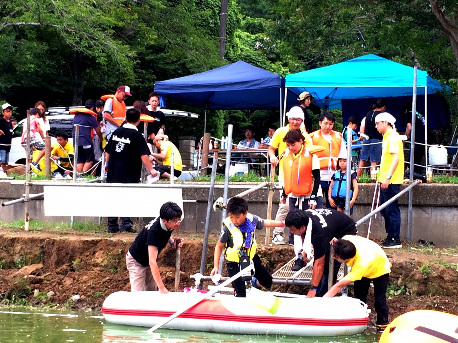 「八鶴湖クルーズ」ではボートを利用し、八鶴湖の水質に直に触れてもらうことで、八鶴湖の水質及び環境改善に対する意識の向上を図ります。 対象者は小学生とお父さん、またはお母さんの2組1チームでボートに乗り15分以内に湖畔のコースをクルーズし、景品が当たる抽選番号をGETしてもらう競技です。コースはボートに慣れてもらう練習ゾーン、そして中継ポイント「釣りゾーン」にて抽選番号を吊り上げてもらいます。そして「問題ゾーン」では八鶴湖にちなんだ問題をGETし、ゴールテントで答え合わせ、正解すればもう一つ抽選番号がもらえる仕組みです。抽選番号は最後までもってると良いことが起こるかも!!