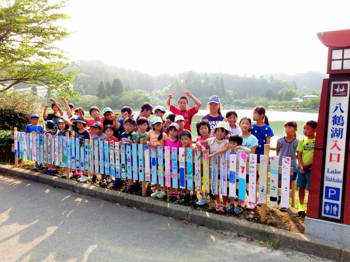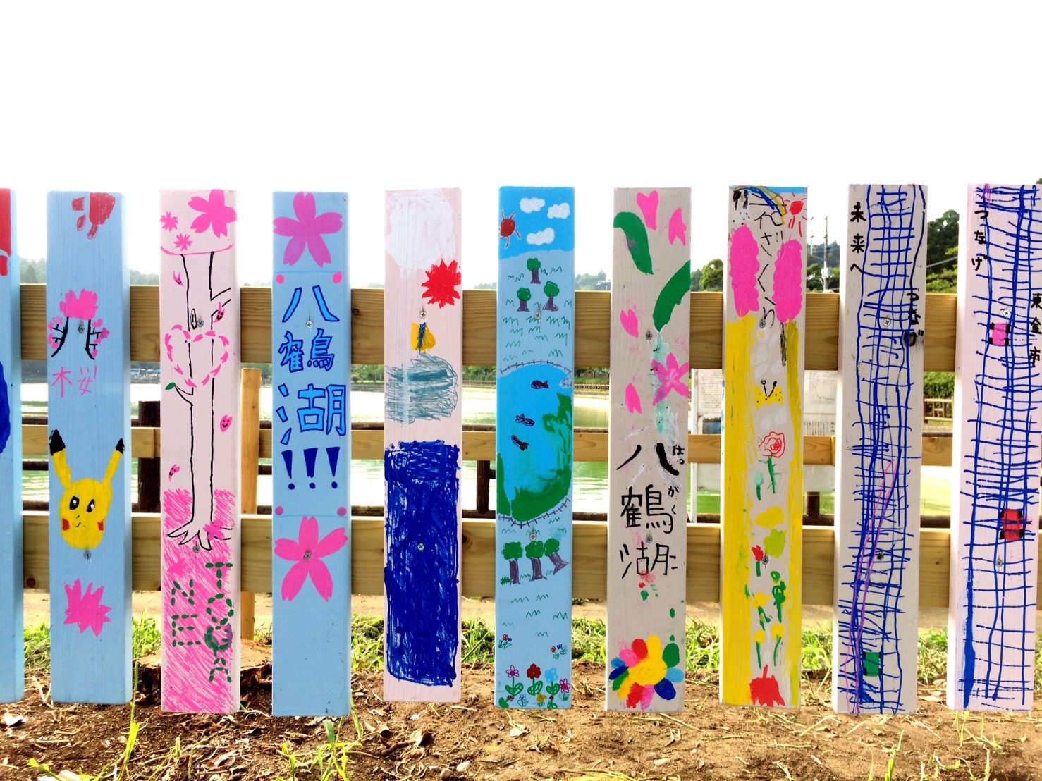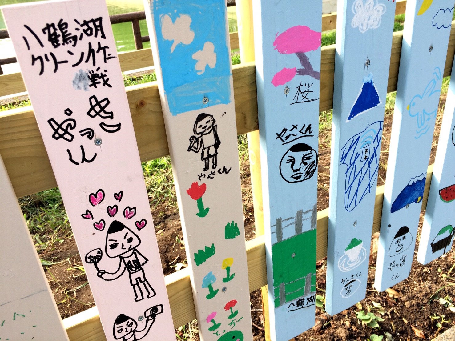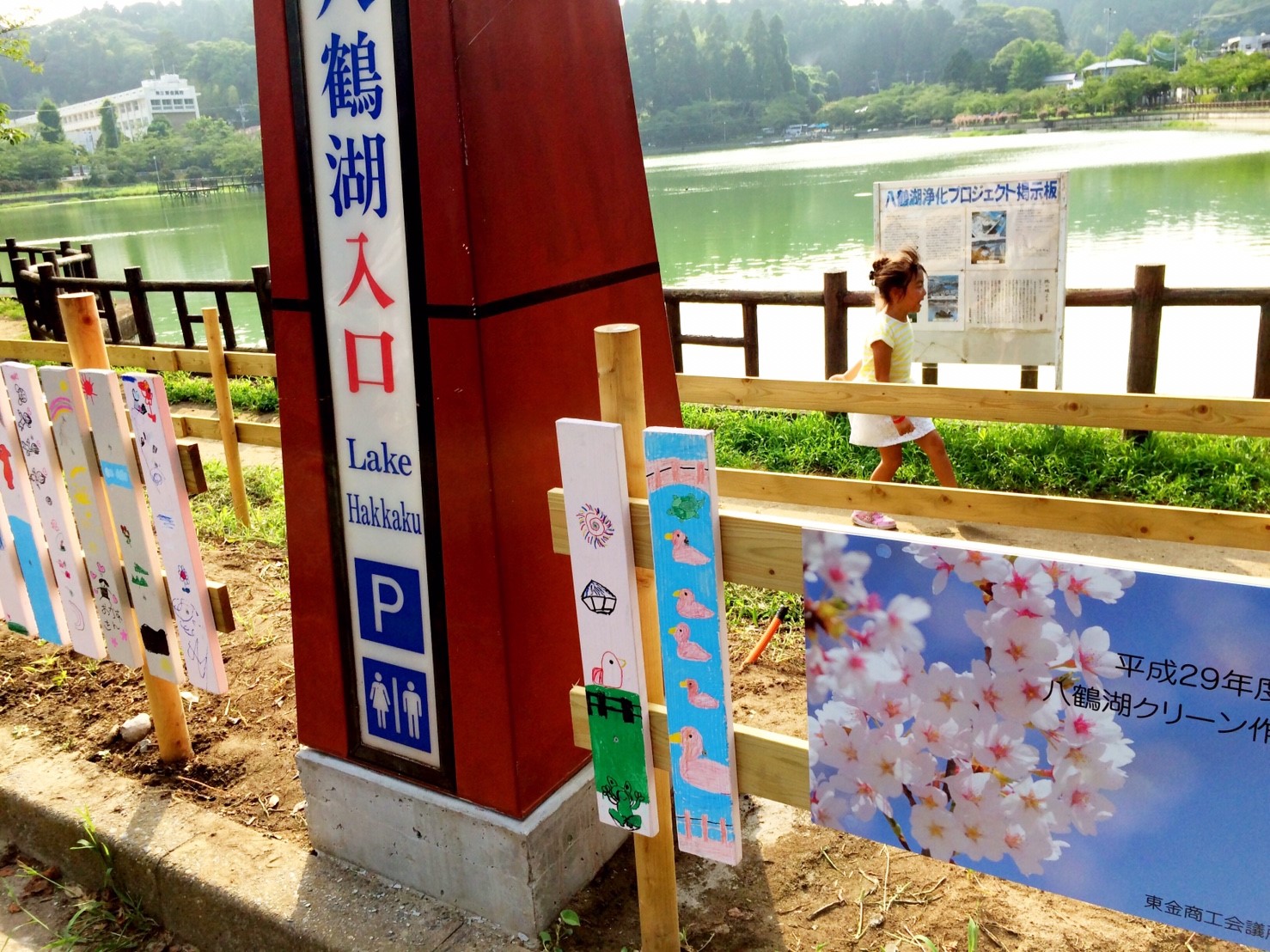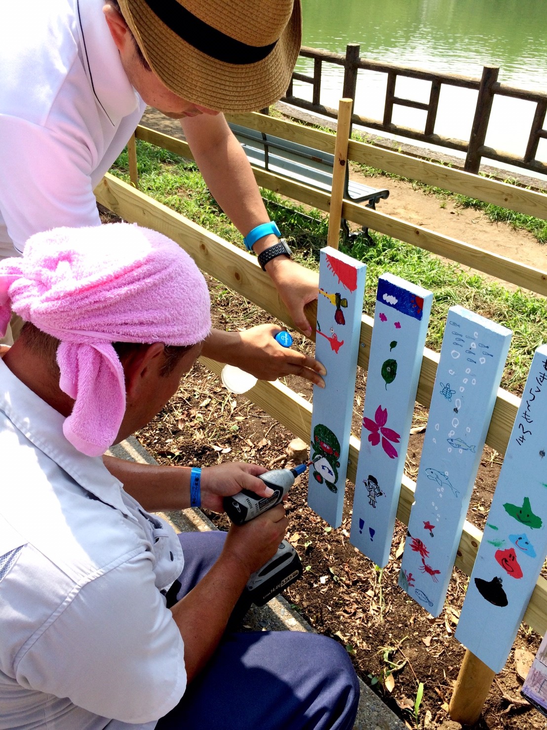 湖畔では桜の植樹を11月に行う前に部員で整備し柵の下地を作り、一般参加者に柵を色取ってもらい、ビスで取り付けてもらいます。作品に応じてデザイン賞を贈呈します。また八鶴湖入口にあった灯篭を植樹する角に設置します。