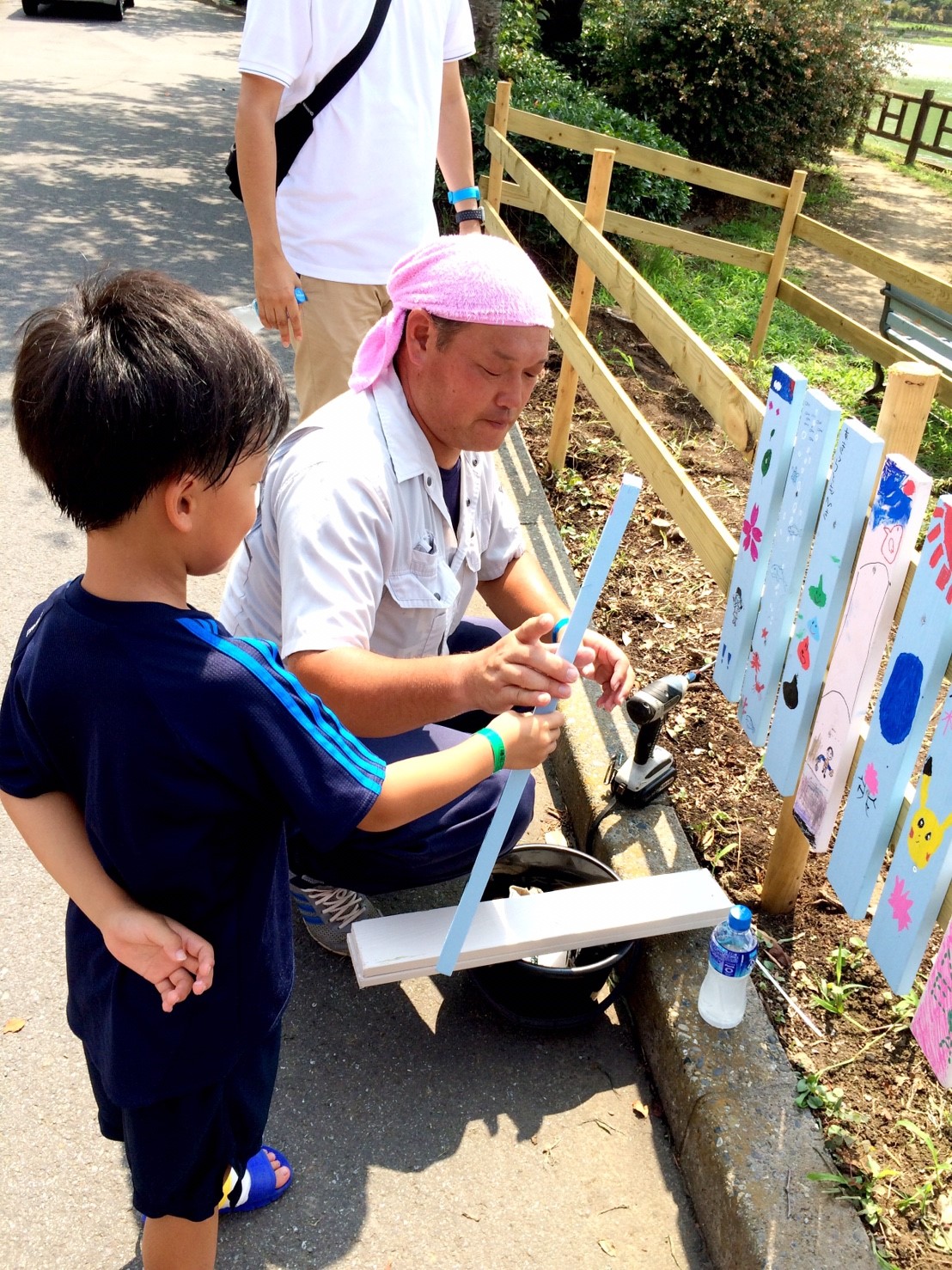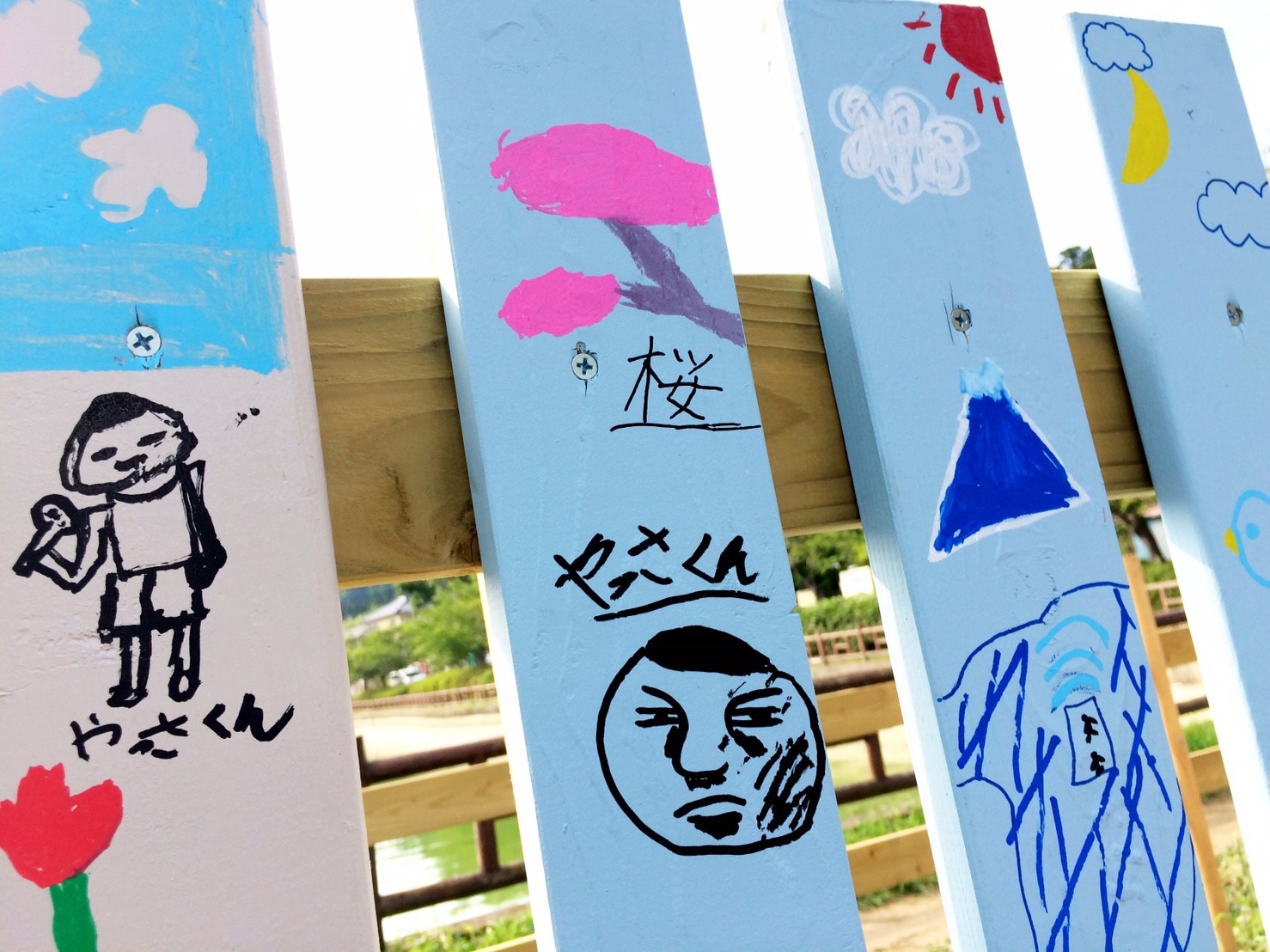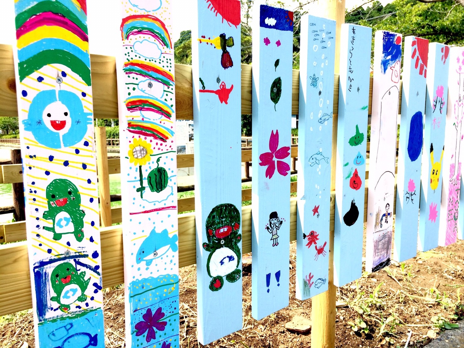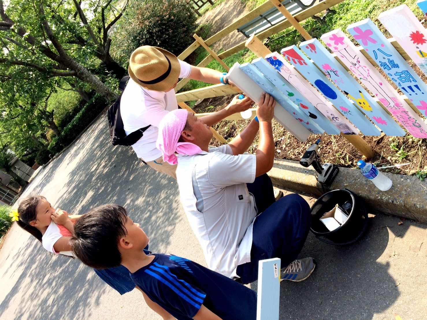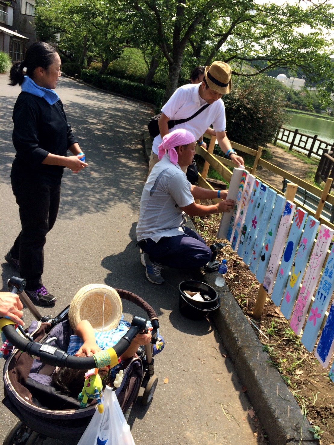 湖畔では桜の植樹を11月に行う前に部員で整備し柵の下地を作り、一般参加者に柵を色取ってもらい、ビスで取り付けてもらいます。作品に応じてデザイン賞を贈呈します。また八鶴湖入口にあった灯篭を植樹する角に設置します。
