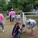 参加いただきました皆様に柵を色取ってもらい、担当者指導の下、柵をノコギリで切ったり、柵のねじ止めなどを行いました。