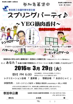 3/29(火)に今年一年を振り返ったお疲れ様パーティ。 「スプリングパーティ」を開催します。からだを動かすレクリエーションの部。美味しい食事とドリンク、気遣いしない楽しい会話での懇親会の部。で構成される異業種交流パーティです。親睦を深めていきましょう!!